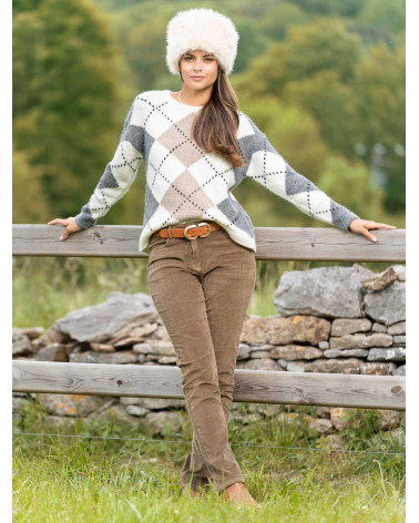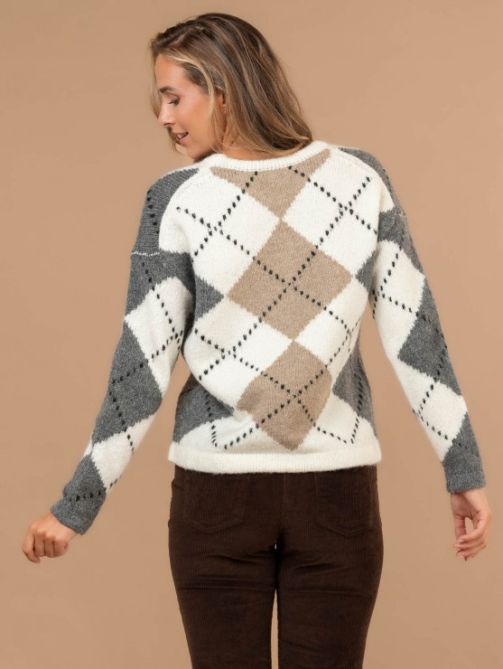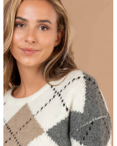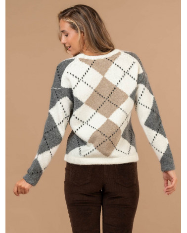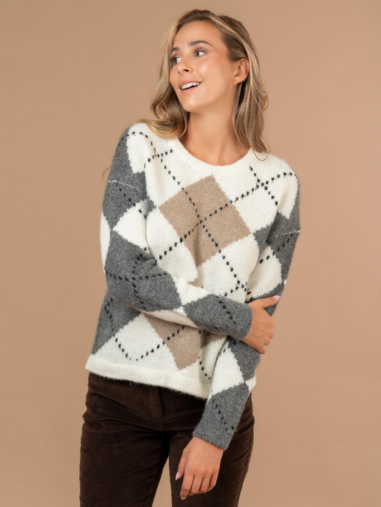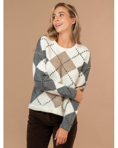 Restez au chaud avec style grâce à ce pull pour femme au motif de losanges. Tant avec un jean qu'un pantalon uni, il vous donnera le sourire cet hiver grâce à ses couleurs de saison et son motif original ! Existe en deux coloris. Longueur totale pour une taille 1 : 58 cm environ. Notre mannequin mesure 1,73m et porte une taille 1.