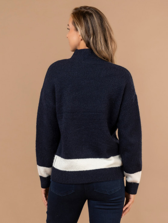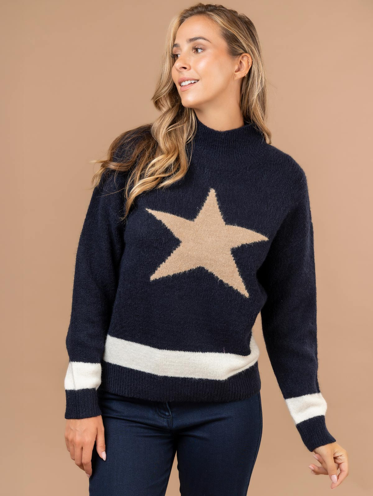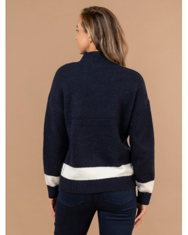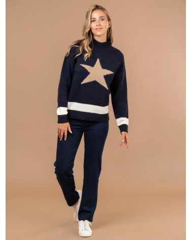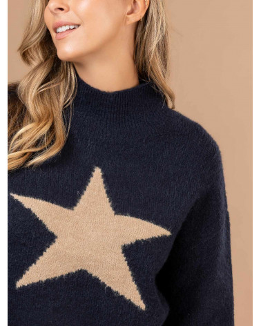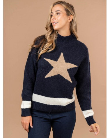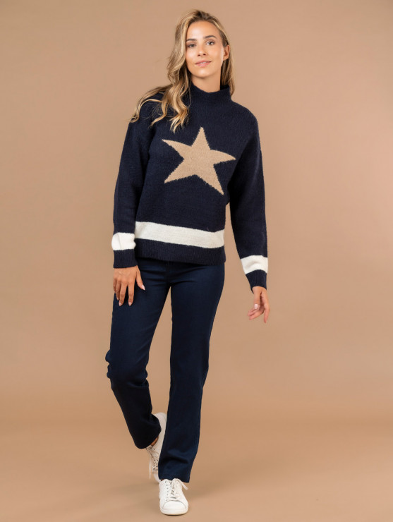 Chaud et cozy, ce pull pour femme au col montant et au dessin d'étoile est idéal pour affronter le froid avec allure ! Existe en marine et noir. Longueur totale pour une taille 1 : 60 cm environ. Notre mannequin mesure 1,75m et porte une taille 1.