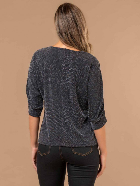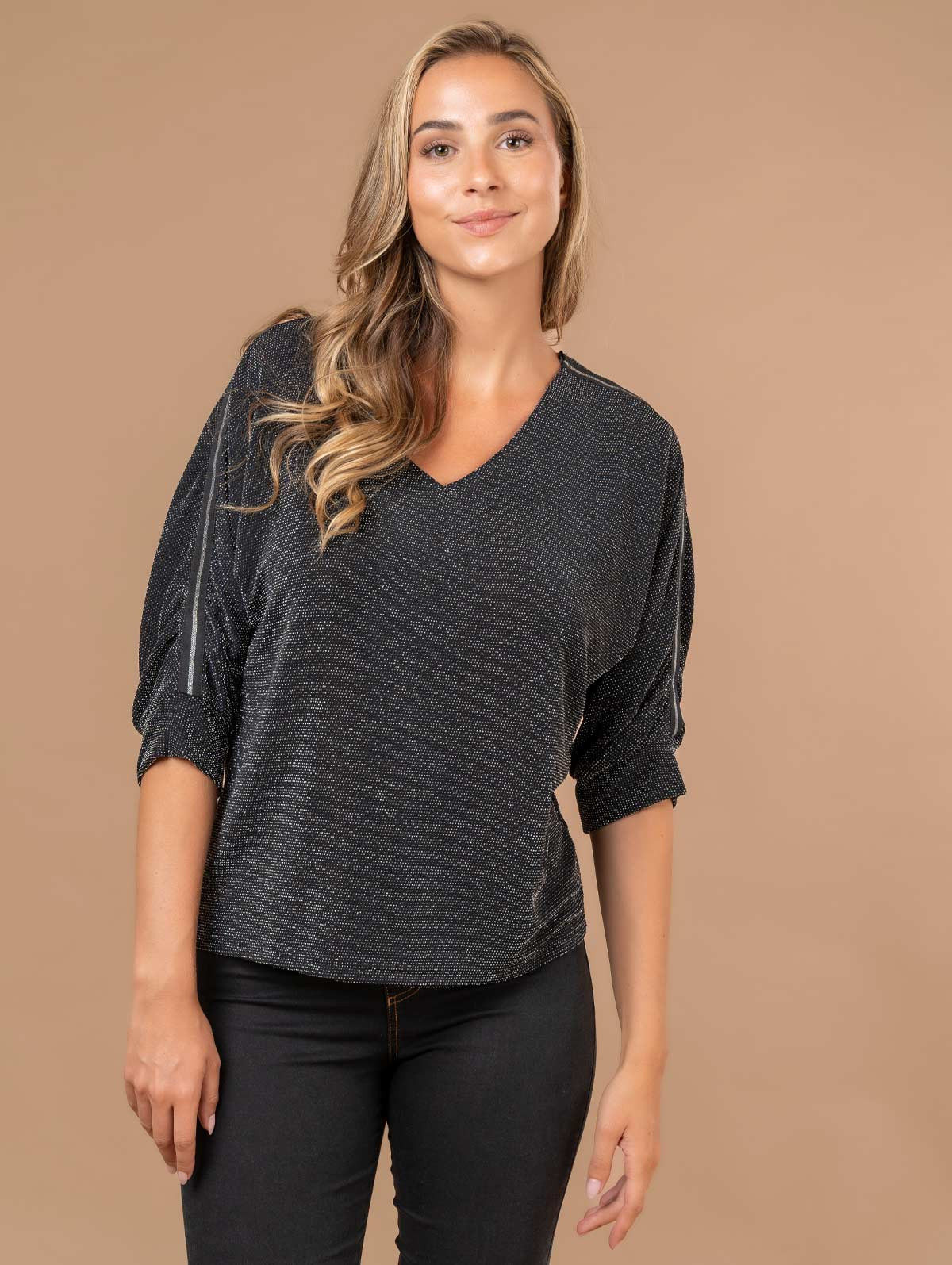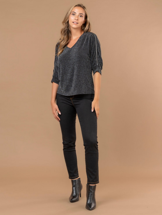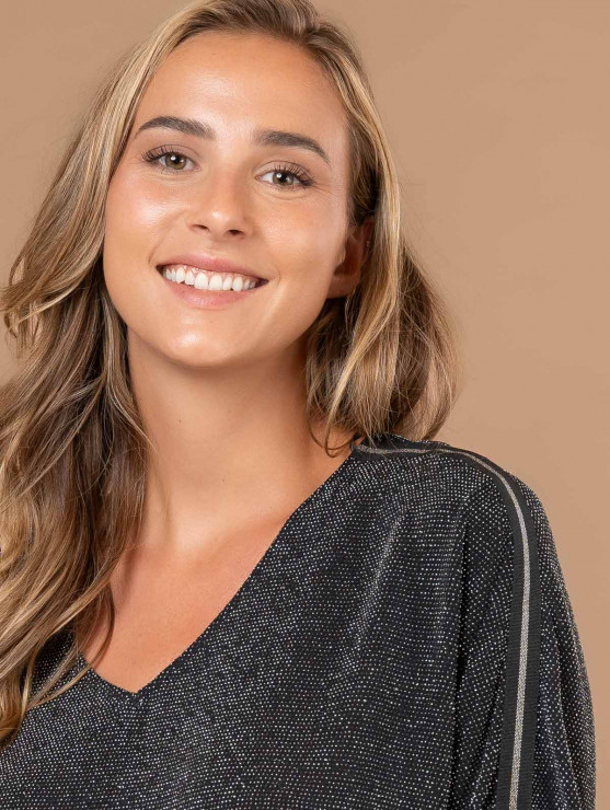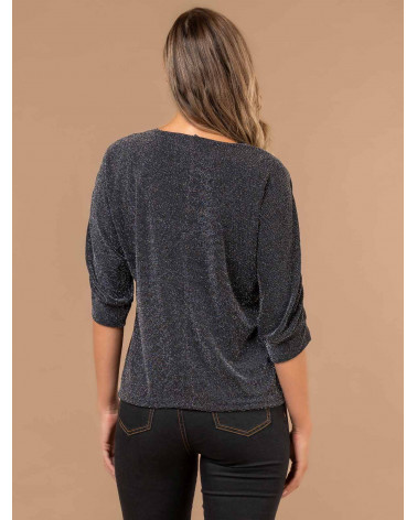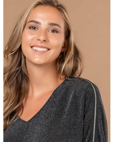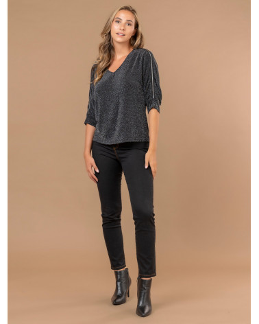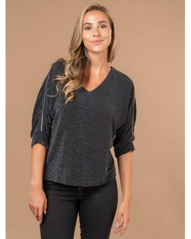 Craquez pour ce top pour femme en maille avec strass, idéal pour les fêtes ! On aime son tissu brillant, ses manches 3/4 et ses jolis galons fantaisie ornés de fil lurex qui agrémentent ses manches. Existe en argent et multico. Longueur totale pour une taille 1 : 60 cm environ. Notre mannequin mesure 1,75m et porte une taille 1.