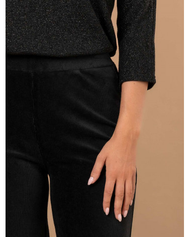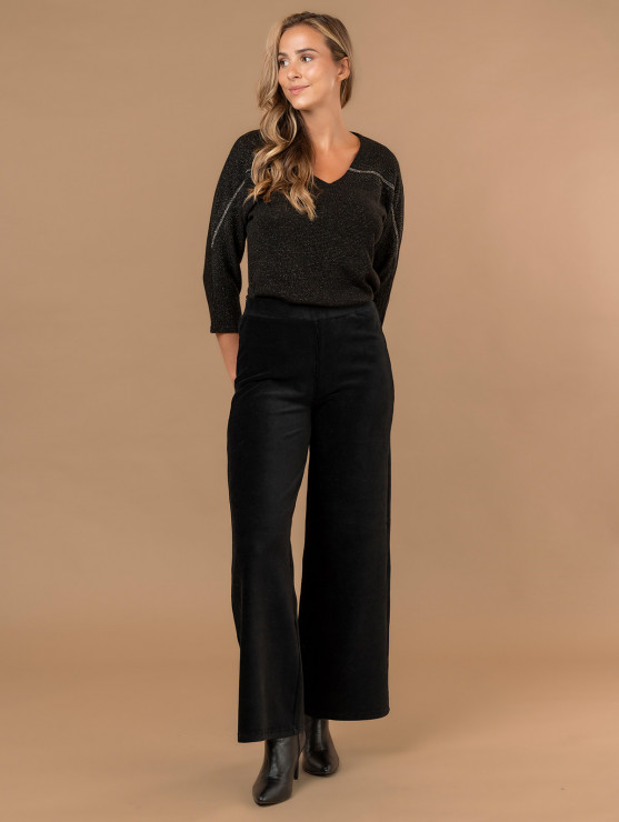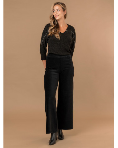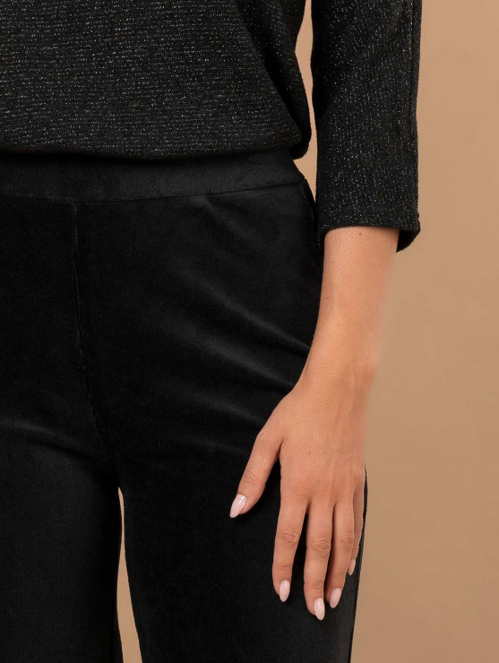 Parfait pour la saison, ce pantalon large pour femme en velours côtelé a tout bon ! Très confortable grâce à sa ceinture élastiquée et à son tissu souple, il s'insèra parfaitement dans vos tenues du quotidien comme celles des occasions plus habillées. Existe en marron et noir. Longueur totale pour une taille 1 : 102 cm environ. Notre mannequin mesure 1,75m et porte une taille 1.
