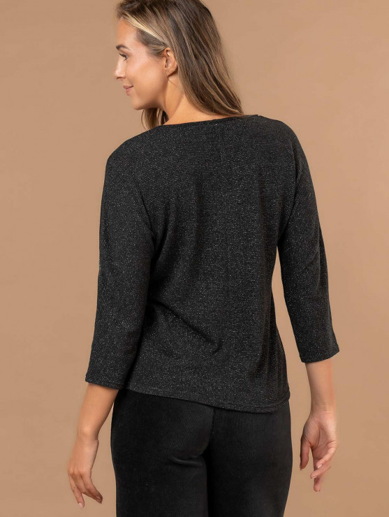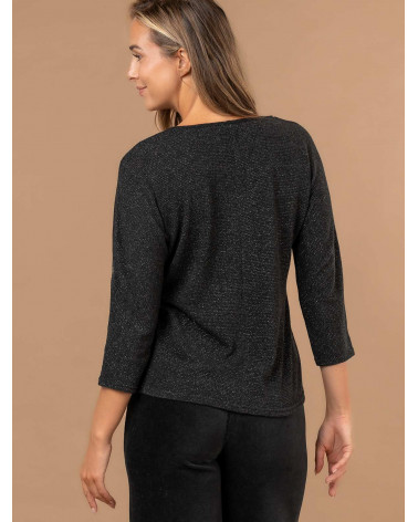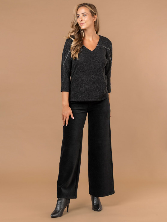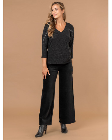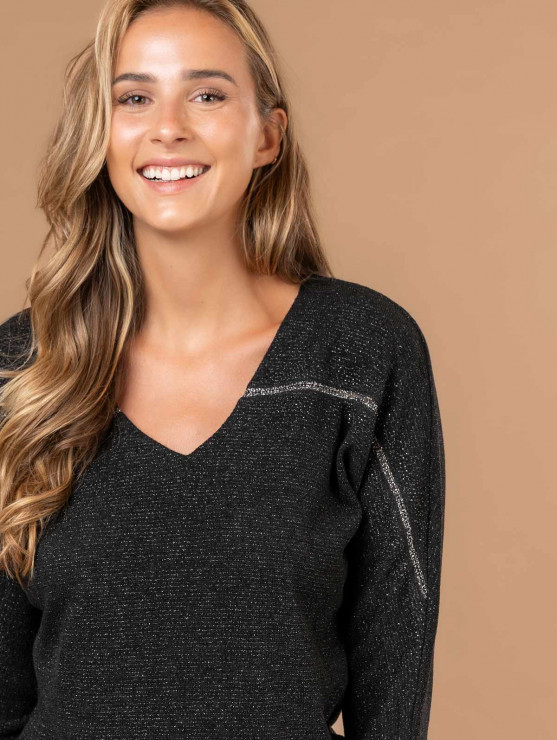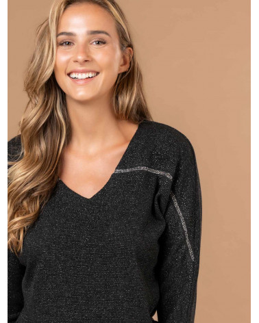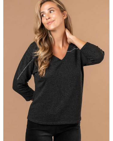 Craquez pour l'élégance de ce top pour femme en maille avec strass. Vous aimerez son col V, ses manches 3/4 ainsi que son joli galon ajouré ! Existe en beige et noir. Longueur totale pour une taille 1 : 62 cm environ. Notre mannequin mesure 1,75m et porte une taille 1.