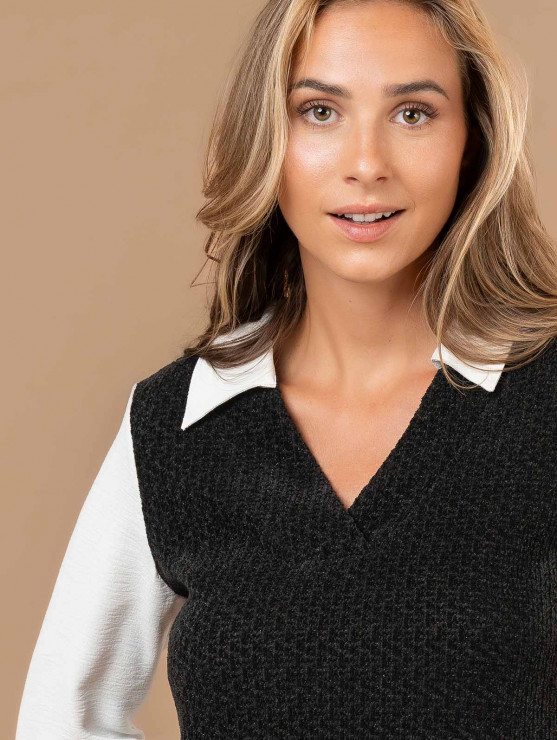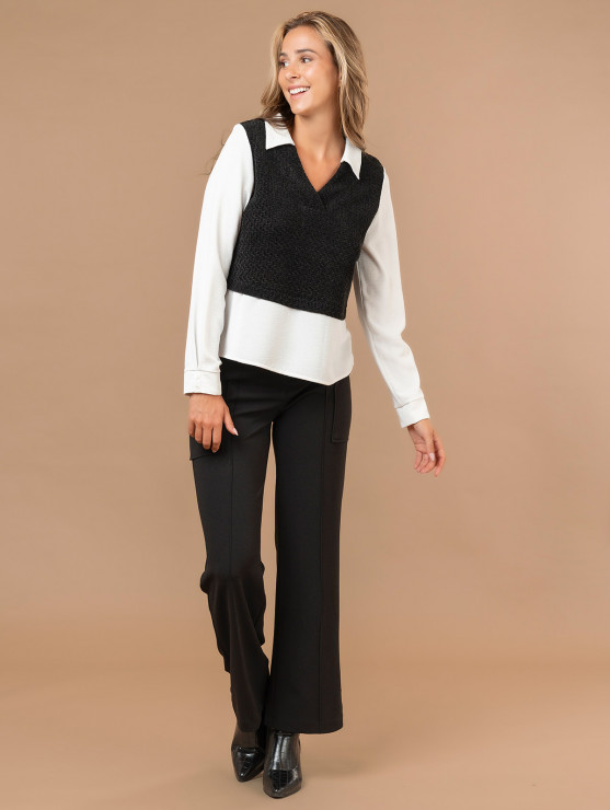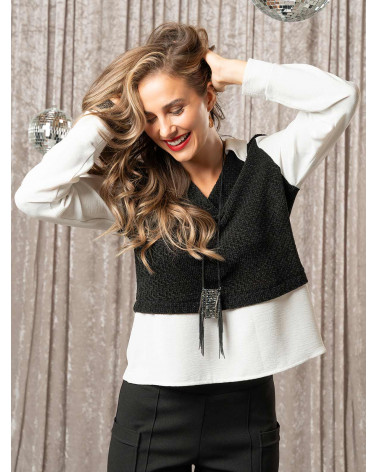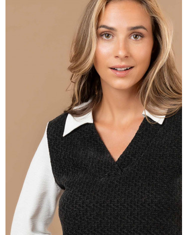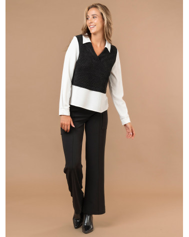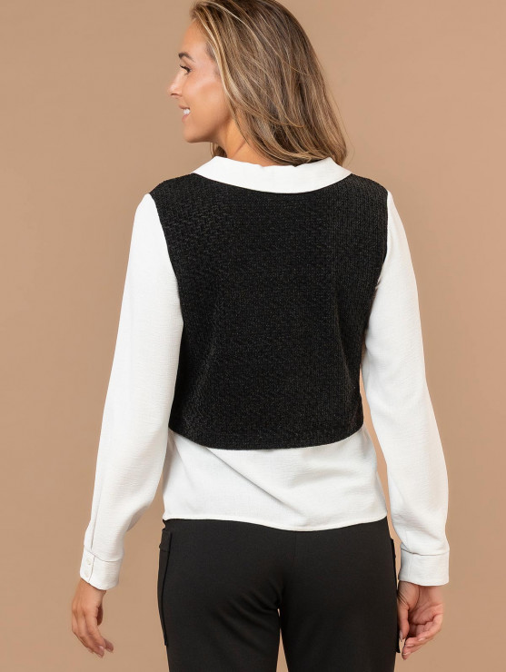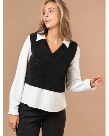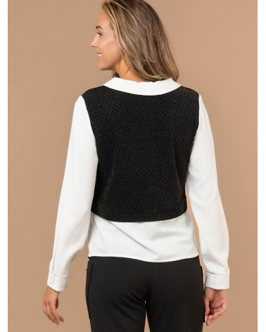 Sobre et élégante, cette chemise 2-en-1 effet pull est un vrai coup de coeur ! On aime son joli jeu d'empiècements, mêlant maille fantaisie et tissu fluide style chemise. Existe en noir/blanc. Longueur totale pour une taille 38 : 61 cm environ. Notre mannequin mesure 1,75m et porte une taille 38.