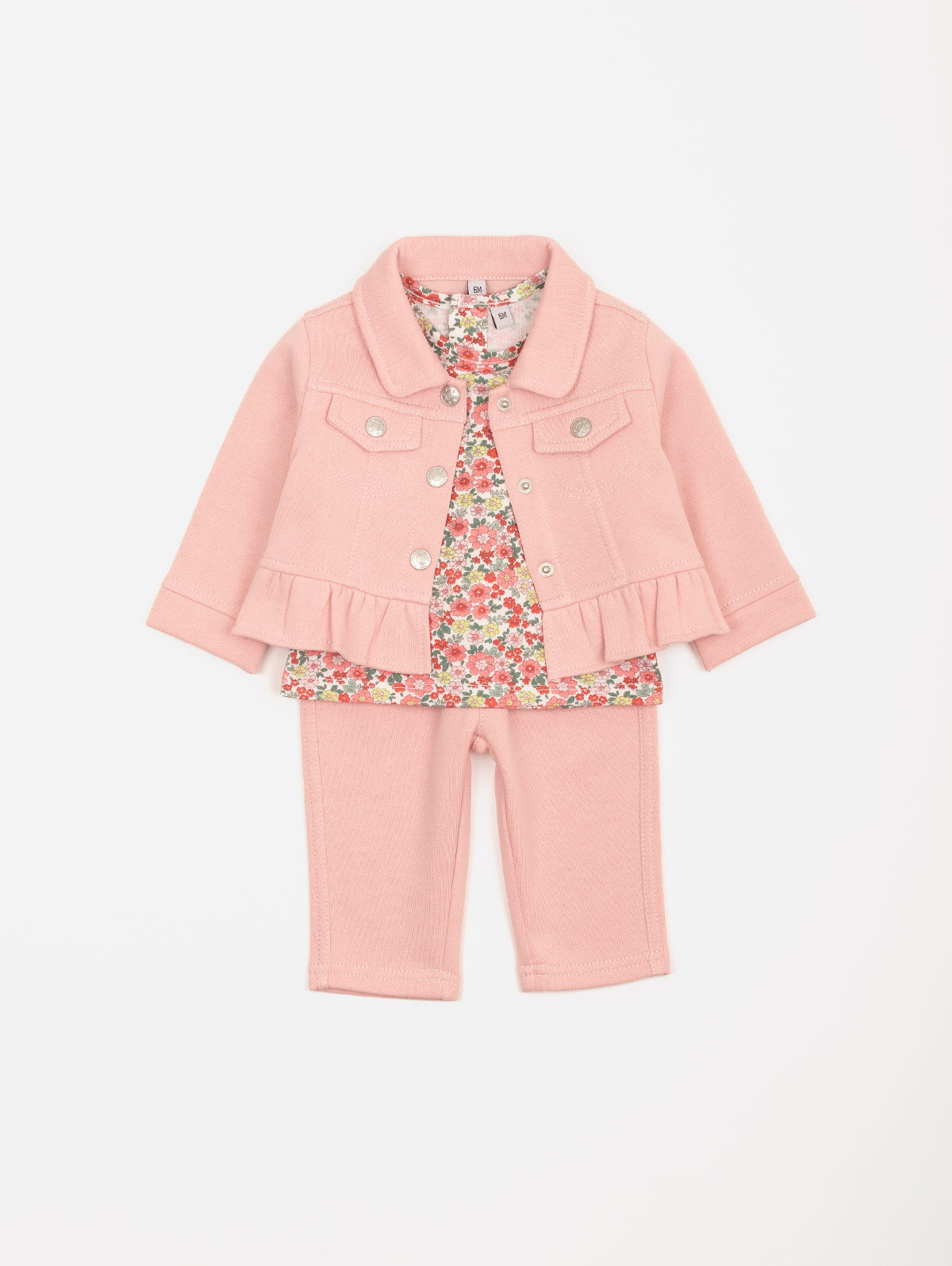 Frais et tout en douceur, cet ensemble 3 pièces pour bébé-fille est idéal pour la saison ! On aime sa veste en molleton avec fausses poches plaquées, boutons pression et volants, son tee-shirt à l'imprimé fleuri et au dos boutonné ainsi que son pantalon à la ceinture élastiquée. Une jolie tenue parfaite pour les premiers rayons de soleil ! Existe en aloe vera et pensée.