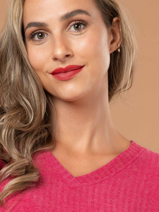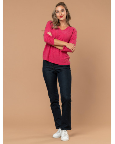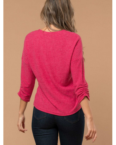 Restez au chaud avec style grâce à ce pull fin pour femme en maille côtelée. On aime son tissu fluide et ses manches 3/4 aux détails de fronces. Existe en fushia et orange. Longueur totale pour une taille 1 : 62 cm environ. Notre mannequin mesure 1,75m et porte une taille 1.