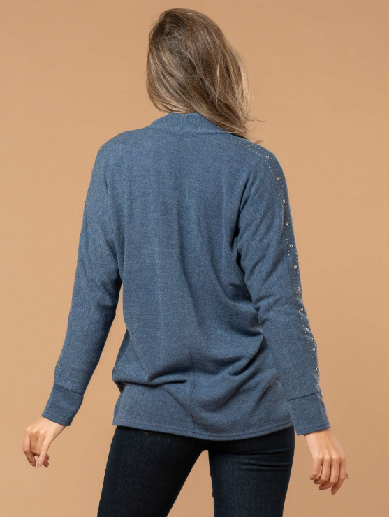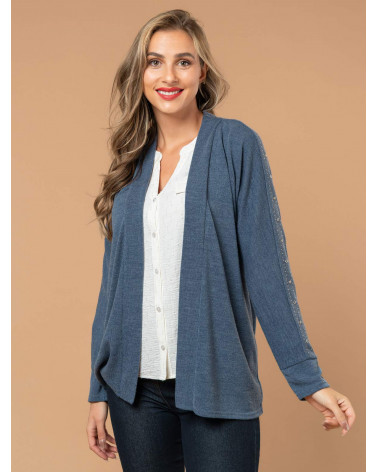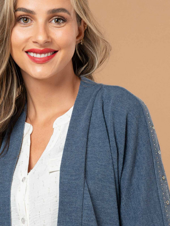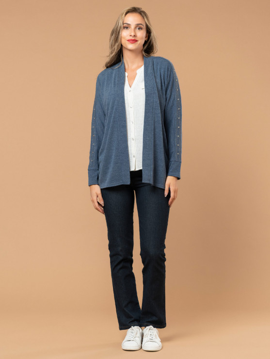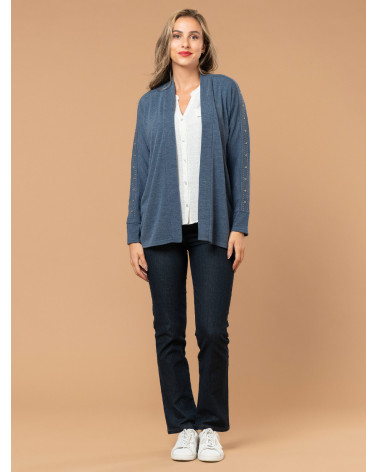 Apportez la touche finale à vos looks de saison avec ce gilet pour femme à la maille fine et légère ! Le plus : des clous et des strass ornent ses manches pour une touche d'éclat et de fantaisie. Existe en indigo et kaki. Longueur totale pour une taille 1 : 71 cm environ. Notre mannequin mesure 1,75m et porte une taille 1.
