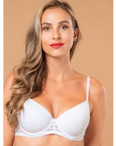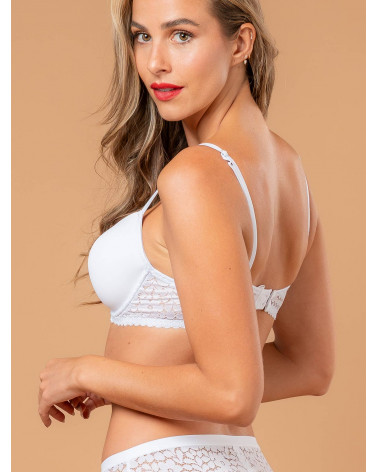 Ce soutien-gorge pour femme alliant dentelle fleurie et microfibre offre maintien et confort tout au long de la journée. Ses bretelles réglables et son armature donneront à votre poitrine un galbe naturel du plus bel effet. Soutien-gorge avec padding. Existe en blanc et bleu foncé.