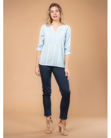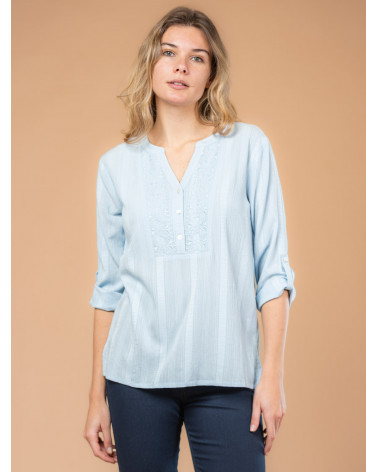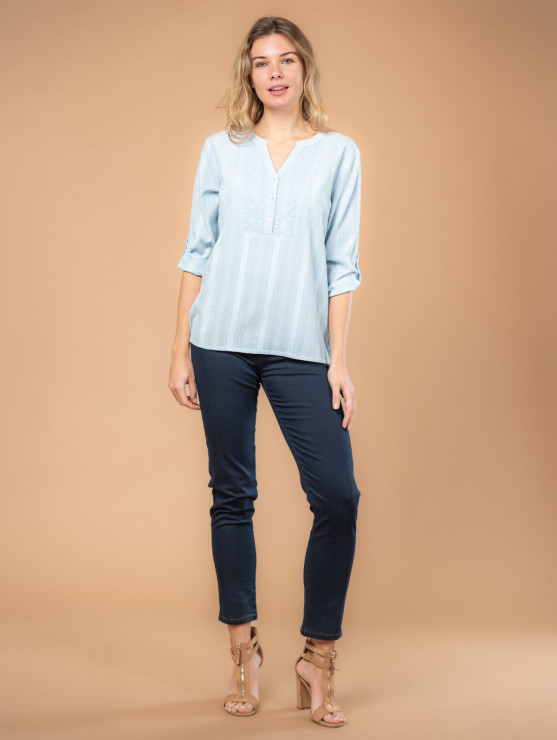 On adore cette blouse pour femme en maille fantaisie avec plastron brodé au motif jacquard. Ses manches boutonnées à la longueur ajustable, ses boutons à l'effet nacré et son tissu légèrement texturé en font une pièce très agréable à porter au quotidien. Existe en blanc et ciel. Longueur totale pour une taille 38 : 66 cm environ. Notre mannequin mesure 1,75m et porte une taille 38.