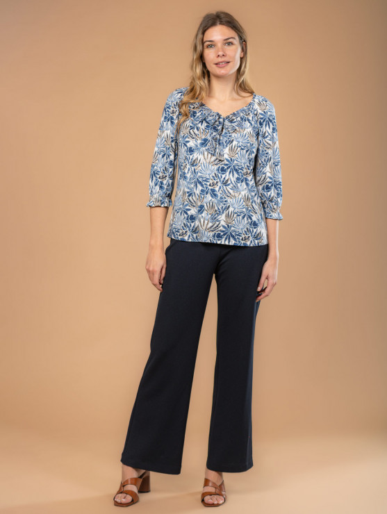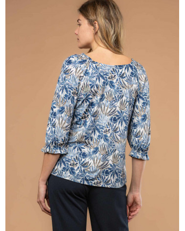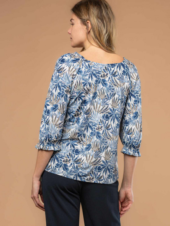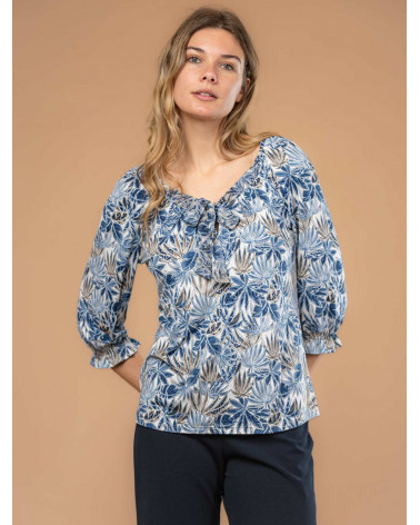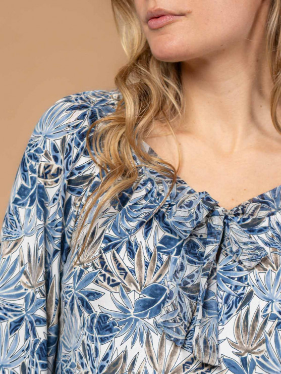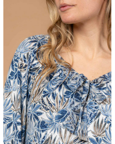 Élégante et féminine, cette blouse pour femme à l'imprimé feuillage et au col noué vous offre un look travaillé en toute simplicité. Vous aimerez son col orné d'un nœud et de fronces, son tissu fluide et agréable ainsi que ses manches 3/4 au bas élastiqué. Existe en vert et bleu. Longueur totale pour une taille 1 : 62 cm environ. Notre mannequin mesure 1,75m et porte une taille 1.