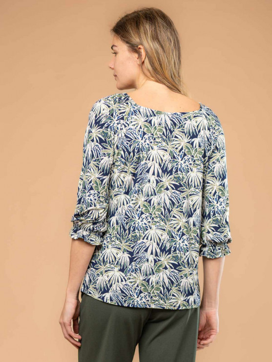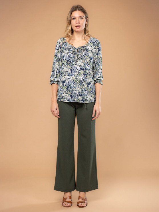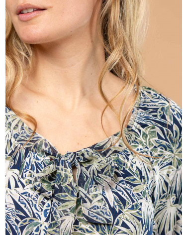 Élégante et féminine, cette blouse pour femme à l'imprimé feuillage et au col noué vous offre un look travaillé en toute simplicité. Vous aimerez son col orné d'un nœud et de fronces, son tissu fluide et agréable ainsi que ses manches 3/4 au bas élastiqué. Existe en vert et bleu. Longueur totale pour une taille 1 : 62 cm environ. Notre mannequin mesure 1,75m et porte une taille 1.