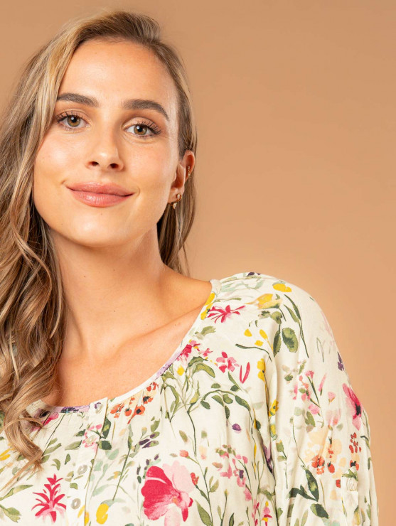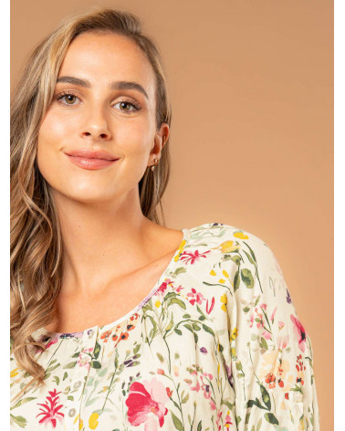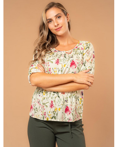 Fluide et agréable à porter, cette blouse pour femme en viscose à l'imprimé floral deviendra vite votre indispensable. Vous aimerez son encolure boutonnée, son tissu léger ainsi que ses manches dotées de passants boutonnés permettant d'ajuster la longueur des manches au gré de vos envies. Existe en deux coloris. Longueur totale pour une taille 38 : 66 cm environ. Notre mannequin mesure 1,75m et porte une taille 38.