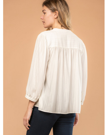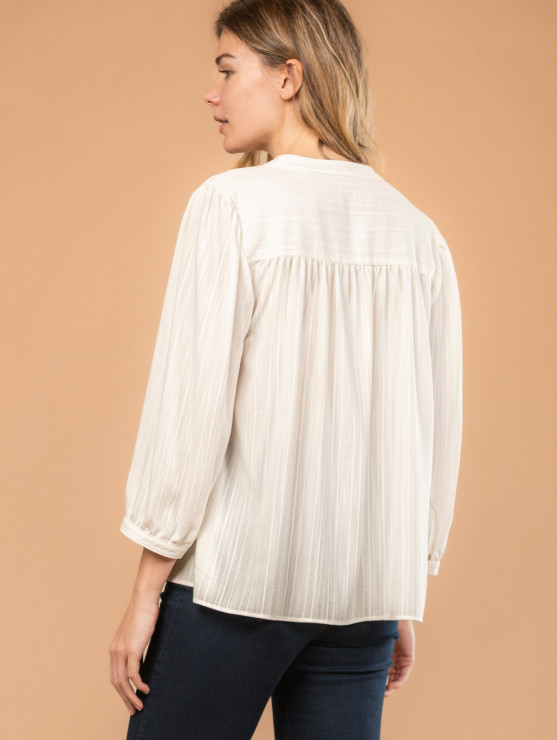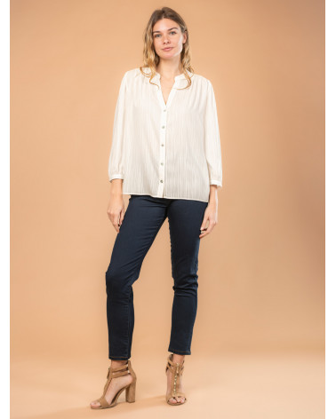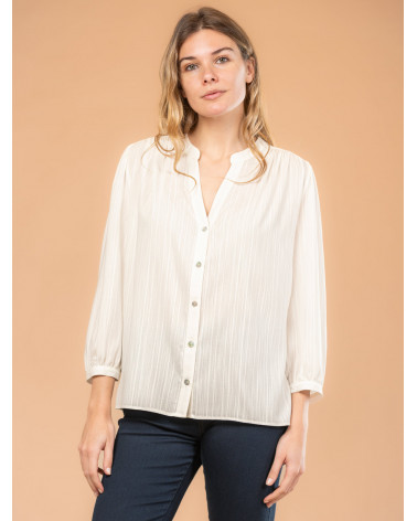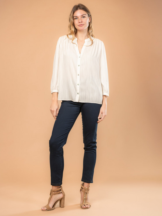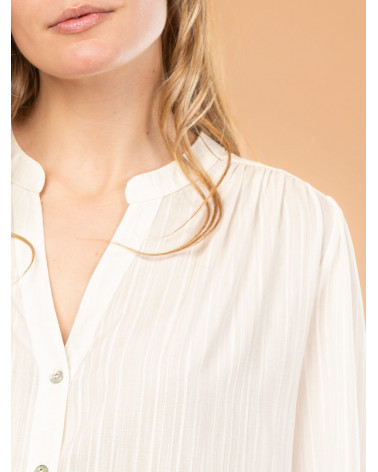 On aime l'élégance de cette chemise pour femme en tissu jacquard, dotée d'un joli col tunisien et de boutons à l'effet nacré. Une pièce sobre et intemporelle qui convient à tous les styles ! Existe en écru et rouge. Longueur totale pour une taille 38 : 66 cm environ. Notre mannequin mesure 1,75m et porte une taille 38.