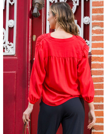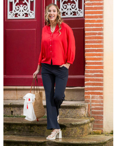 On aime l'élégance de cette chemise pour femme en tissu jacquard, dotée d'un joli col tunisien et de boutons à l'effet nacré. Une pièce sobre et intemporelle qui convient à tous les styles ! Existe en écru et rouge. Longueur totale pour une taille 38 : 66 cm environ. Notre mannequin mesure 1,75m et porte une taille 38.