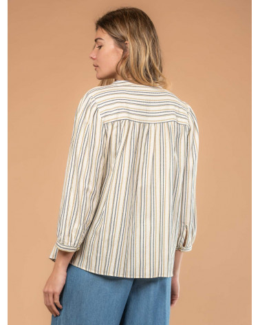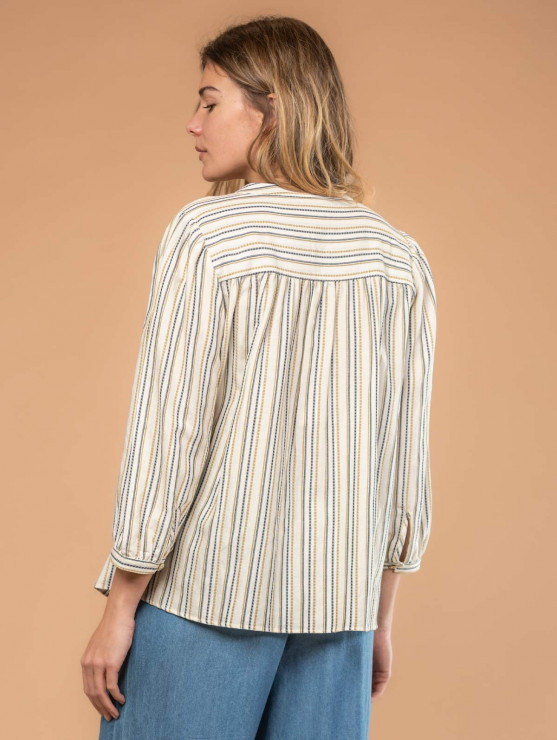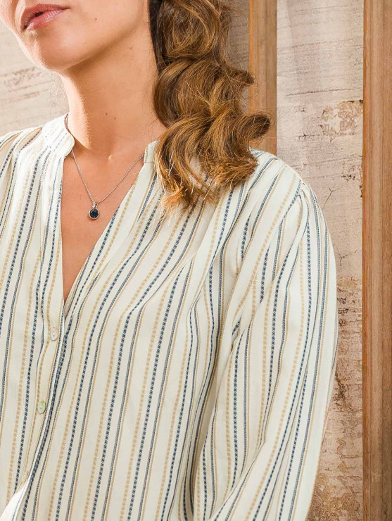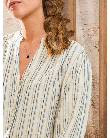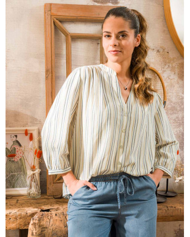 Très agréable à porter, cette chemise pour femme aux rayures jacquard est tout ce que l'on aime ! Dotée de manches 3/4 et de jolis boutons l'effet nacré, son tissu fluide et léger vous accompagnera en tout confort au quotidien. Existe en bleu et kaki. Longueur totale pour une taille 38 : 66 cm environ. Notre mannequin mesure 1,75m et porte une taille 38.