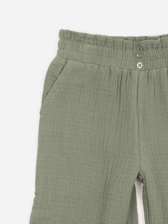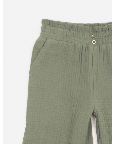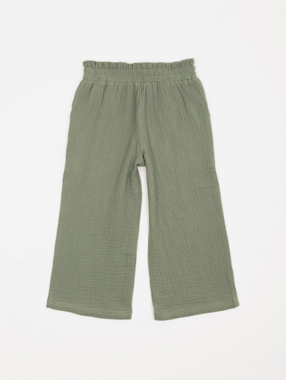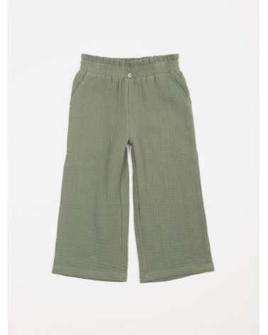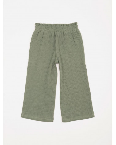 Très agréable à porter, ce pantalon large pour fille en gaze de coton est idéal pour l'été ! On est fans de sa ceinture smock avec boutons fantaisie et de ses deux vraies poches pratiques à l'avant. Une pièce tout en légèreté que votre fille aura plaisir à porter avec un joli top uni ou imprimé pour profiter des journées ensoleillées. Existe en dune et kaki.