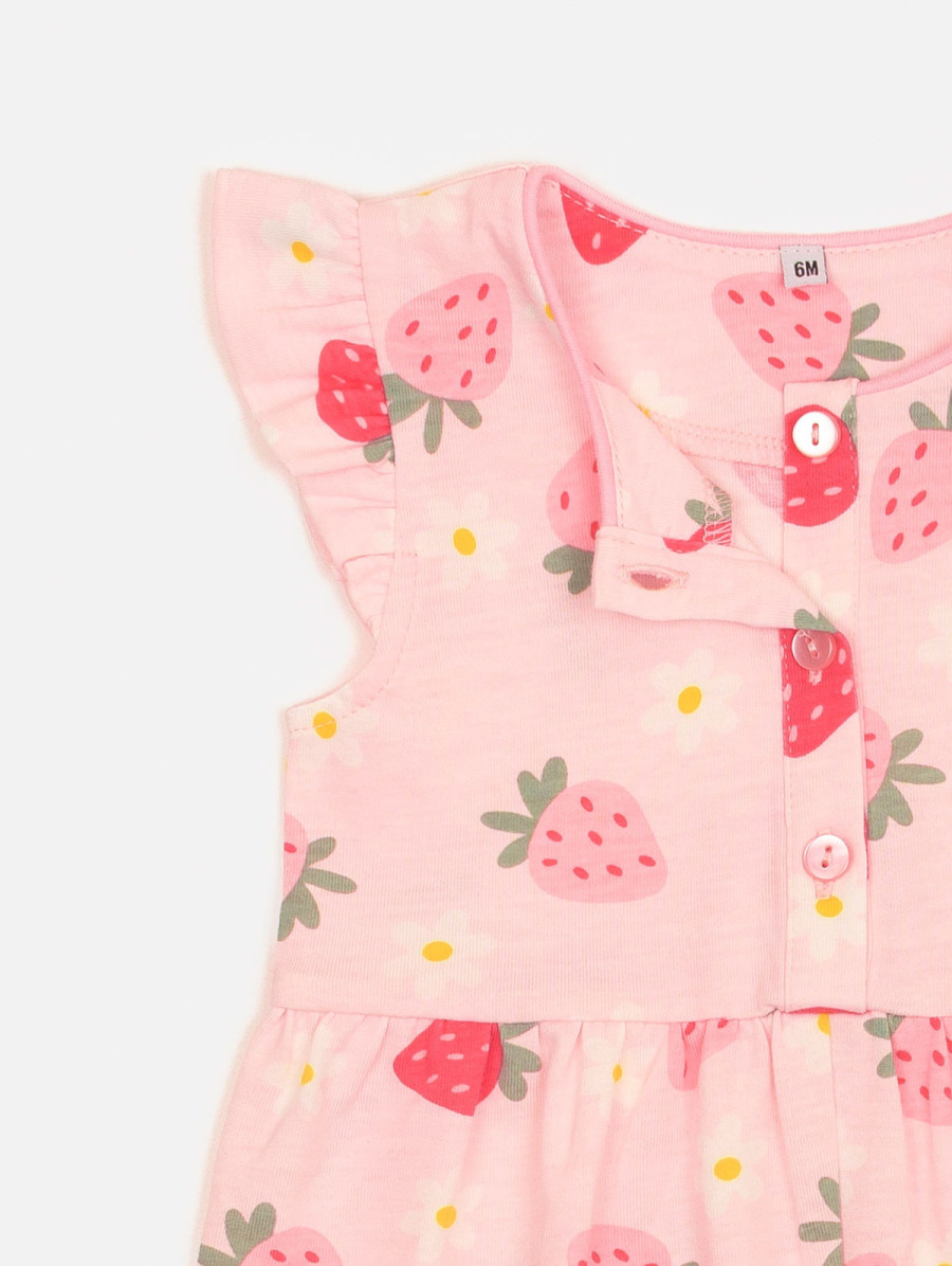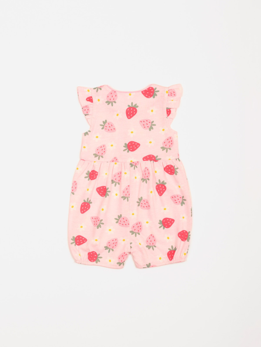 Craquez pour le look fruité de cet adorable combishort pour bébé-fille à l'imprimé fraises. Dotée d'élégants volants aux épaules, cette jolie pièce est dotée d'astucieuses finitions boutonnées et élastiquées ainsi que de boutons-pression à l'entrejambe, facilitant ainsi l'habillement de votre petite princesse. Existe en rose thé et vert d'eau.