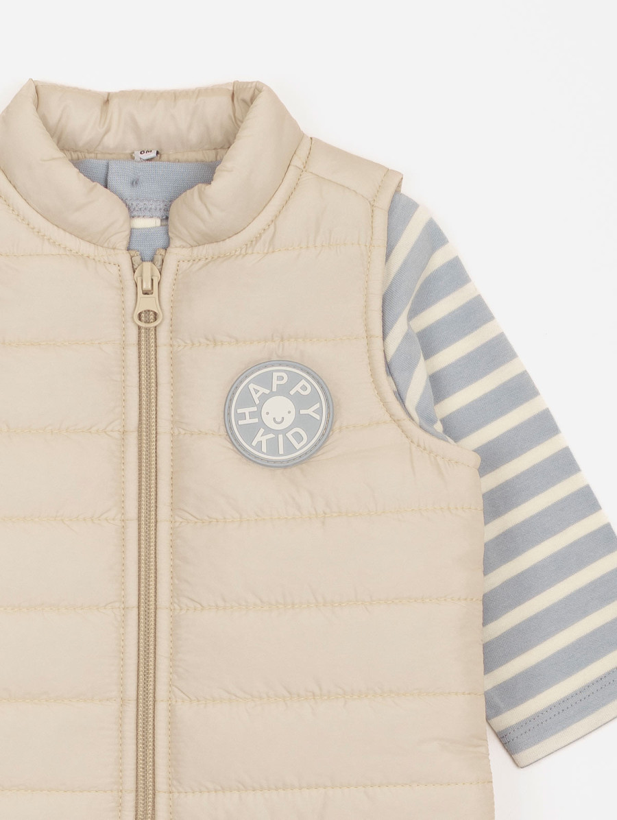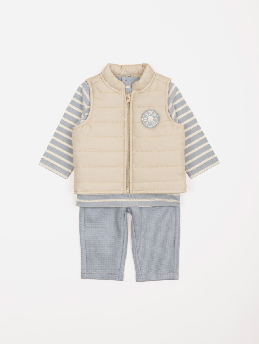 Cet ensemble 3 pièces pour bébé-garçon avec doudoune sans manches, tee-shirt rayé au dos boutonné et pantalon assorti est idéal pour les balades au grand air. Avec cette veste doudoune à fermeture zippée et son pantalon en maille côtelée à la ceinture élastiquée, tout est fait pour que votre bambin soit le plus beau cette saison ! Existe en aloe vera et brume.