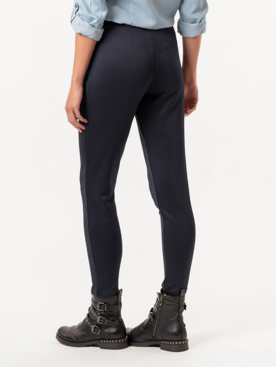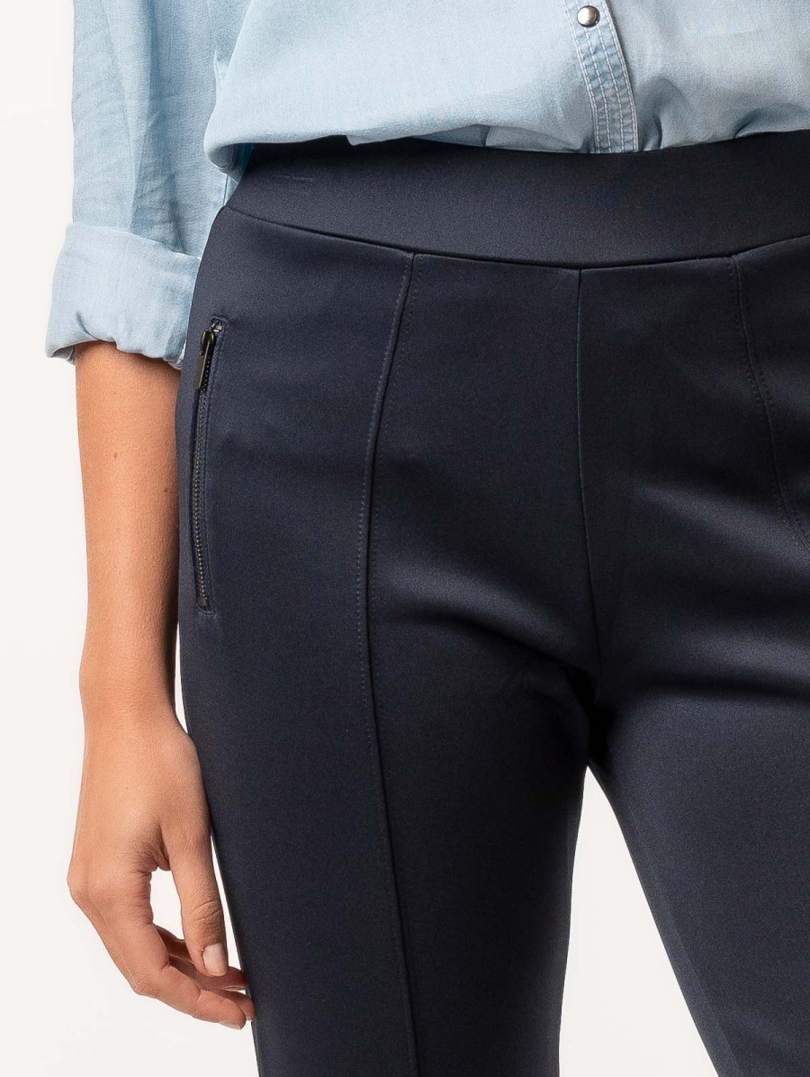 Ne choisissez plus entre confort et élégance. Sobre et confortable, ce pantalon pour femme en matière scuba avec ses poches zippées et sa ceinture élastiquée vous offre un style épuré et efficace grâce à sa surpiqûre. Un cocktail détonnant pour un look garanti. Existe en marine et noir. Longueur totale pour une taille 38/40 : 94 cm environ. Notre mannequin mesure 1,75m et porte une taille 38/40.
