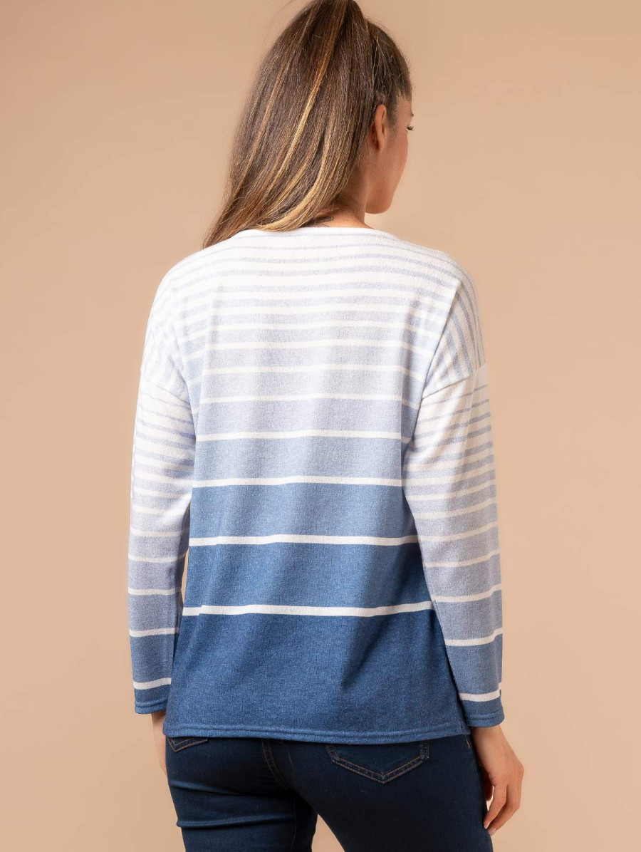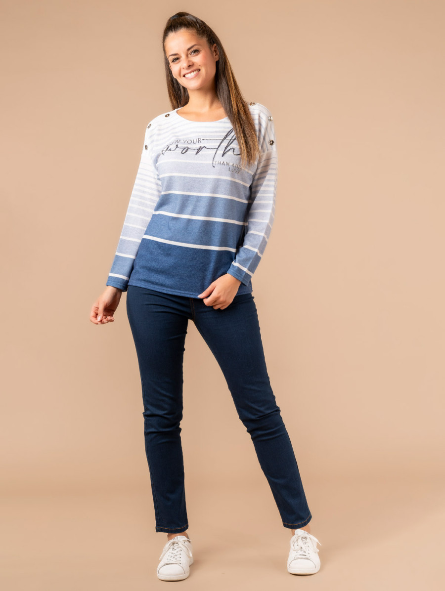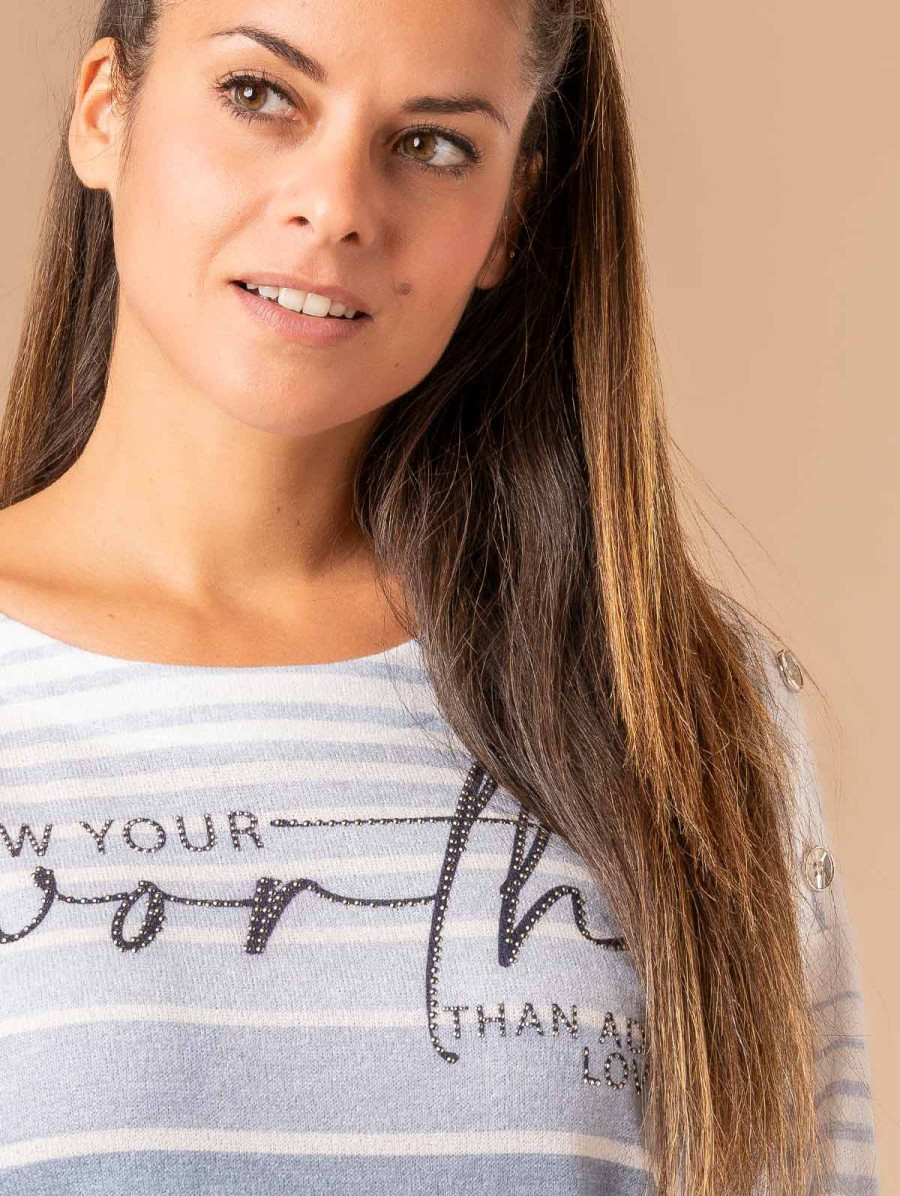 Insufflez un peu d'air marin dans votre look avec ce pull pour femme à l'esprit marinière. Conçu dans une maille douce et confortable, il est doté de jolis boutons fantaisie aux épaules pour toujours plus de style. Existe en bleu et marron. Longueur totale pour une taille 1 : 65 cm environ. Notre mannequin mesure 1,75m et porte une taille 1.