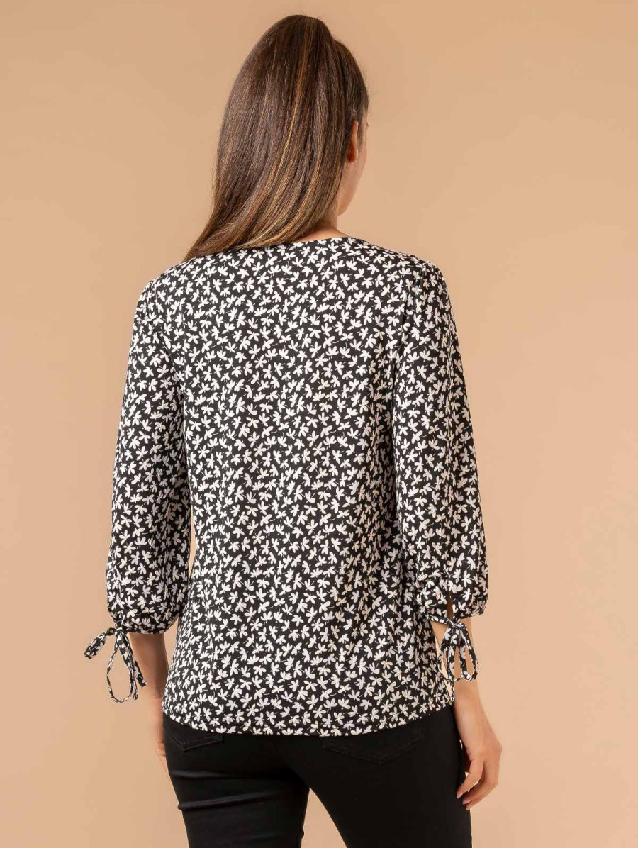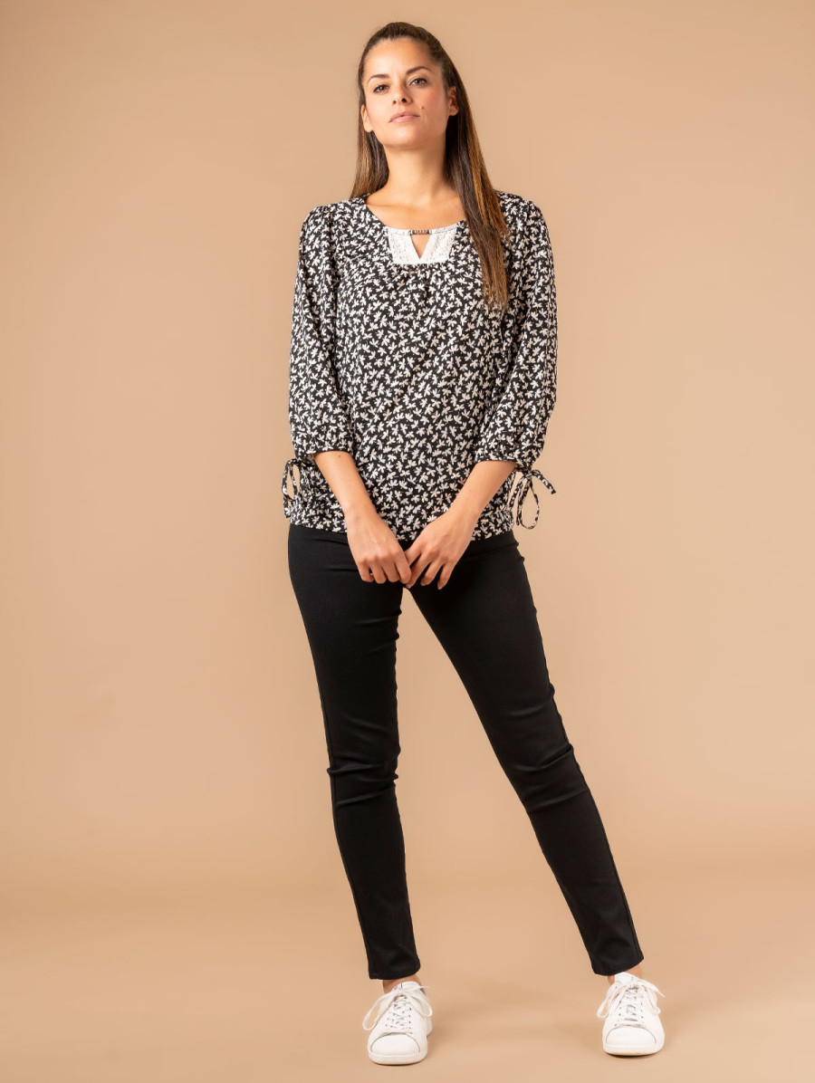 Quoi de mieux qu'une blouse à l'imprimé liberty pour profiter des beaux jours ? Ses fleurs délicates et son empiècement en dentelle au col vous garantissent un look plein de douceur et de féminité. Légère et fluide, cette blouse se marie à merveille avec un jean ou un pantalon uni pour un look chic décontracté. Surimpression gomme et manches 3/4 avec nœud. Existe en marine et noir. Longueur totale pour une taille 1 : 63 cm environ. Notre mannequin mesure 1,75m et porte une taille 1.