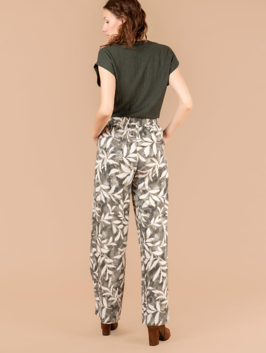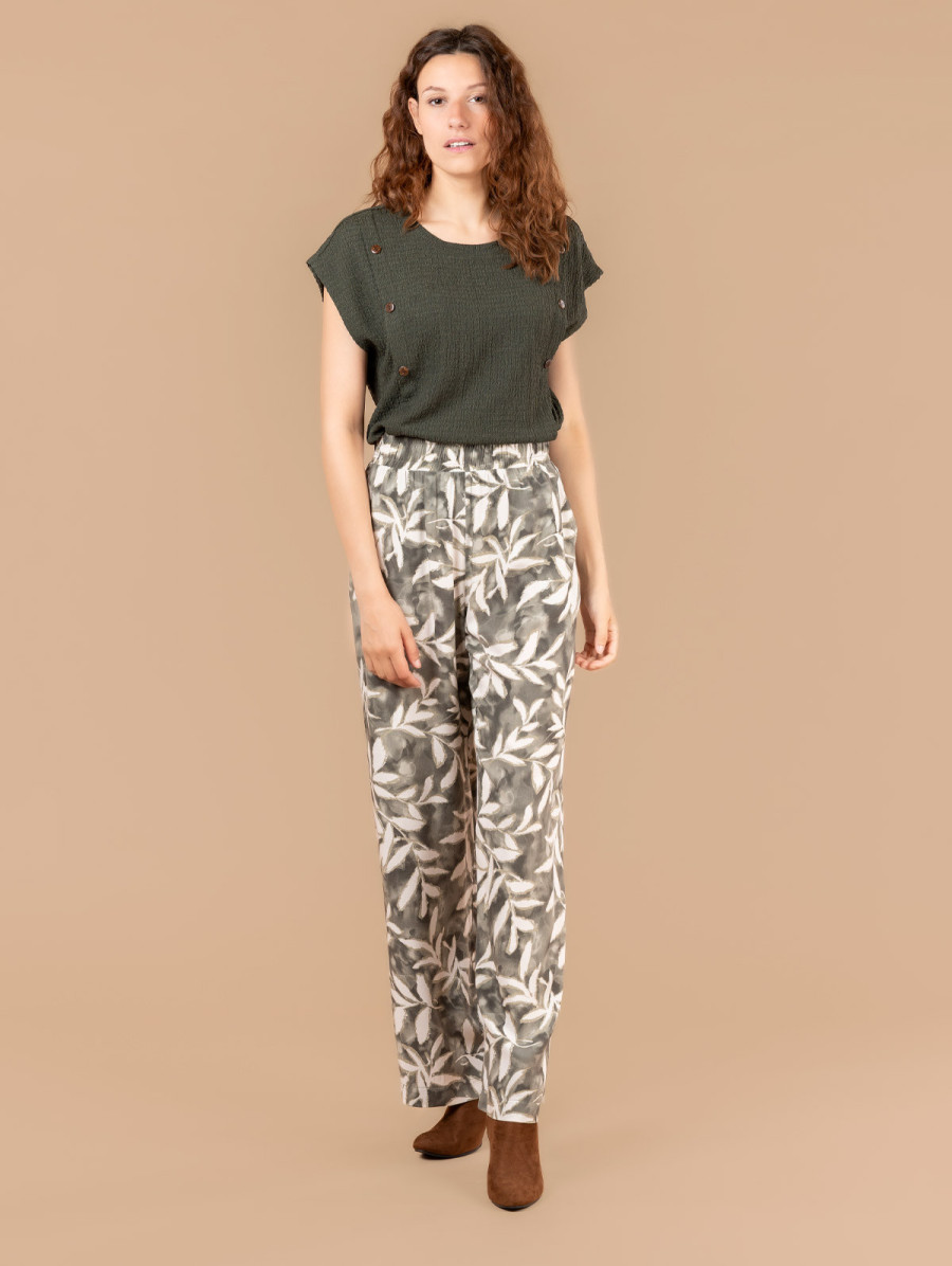 Original et très confortable, ce pantalon fluide à l'imprimé feuillage donnera du peps à tous vos hauts unis. On aime son tissu viscose, et sa ceinture élastiquée avec liens de serrage qui le rendent très agréable à porter. Deux vraies poches avant. Existe en kaki et marron. Longueur totale pour une taille 38 : 105 cm environ. Notre mannequin mesure 1,73m et porte une taille 38.