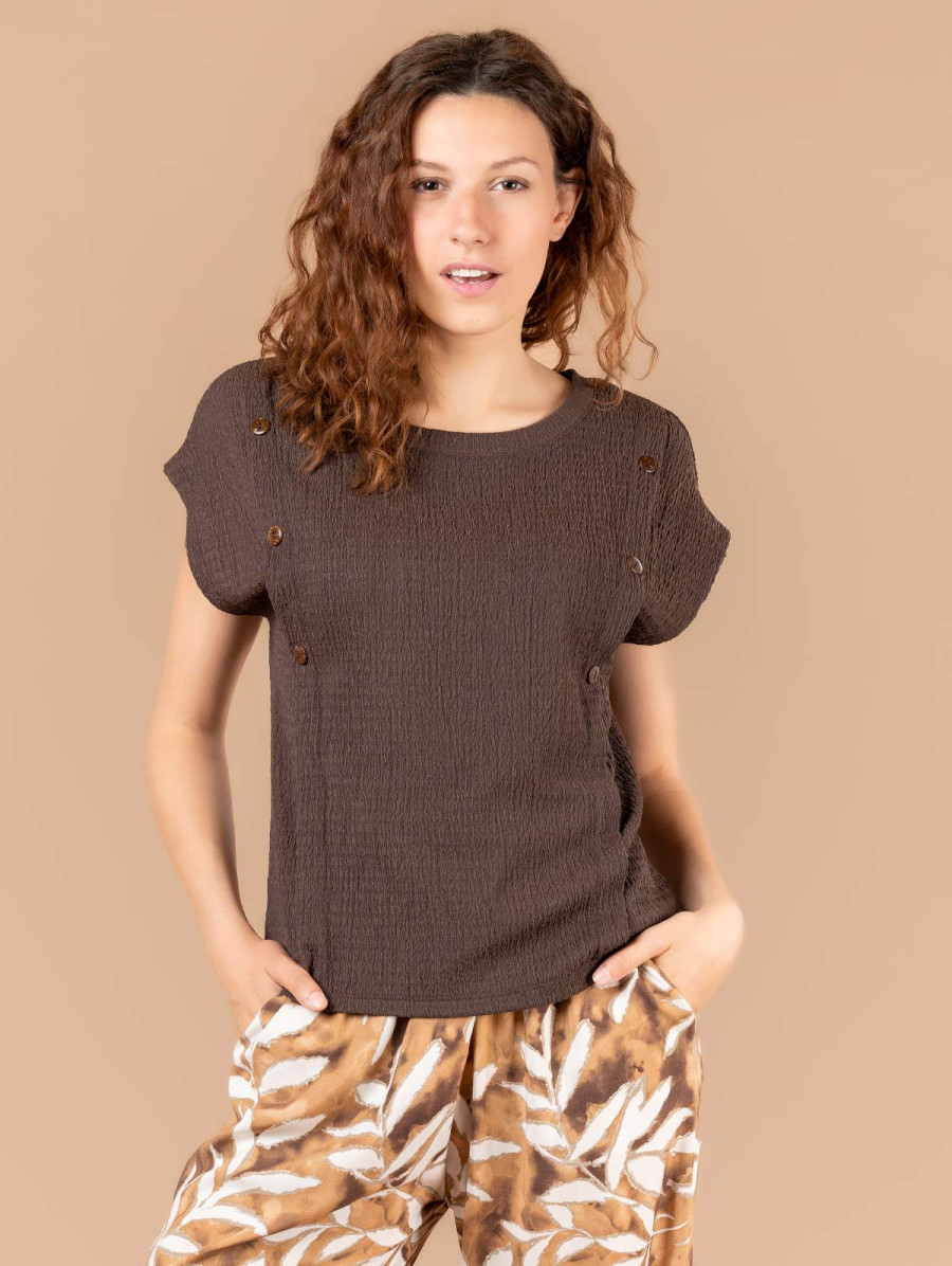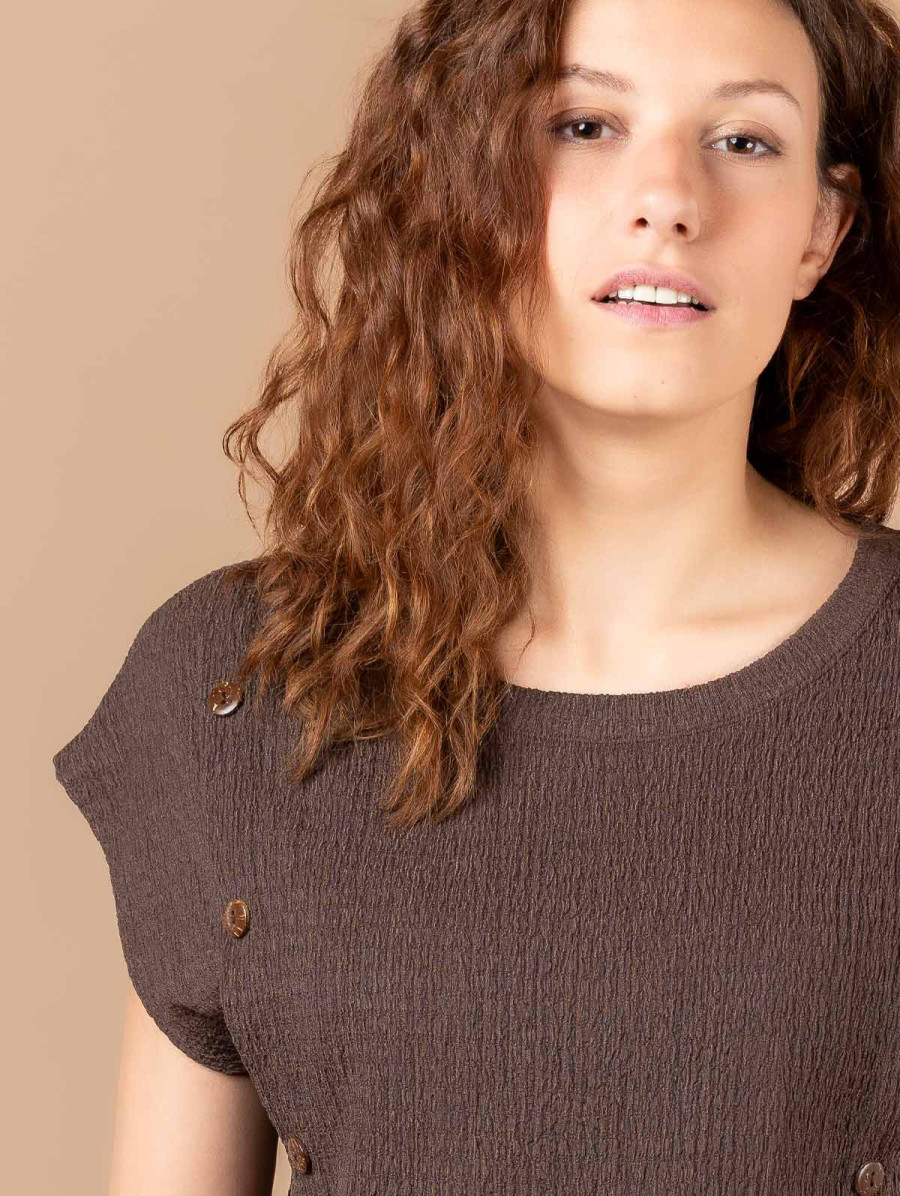 Ce top en maille texturée style "seersucker" avec boutons fantaisie à l'effet bois est un vrai coup de cœur. Idéal avec un pantalon imprimé, il est si agréable à porter que vous ne pourrez bientôt plus vous en passer ! Existe en army et brownie. Longueur totale pour une taille 1 : 58,5 cm environ. Notre mannequin mesure 1,73m et porte une taille 1.
