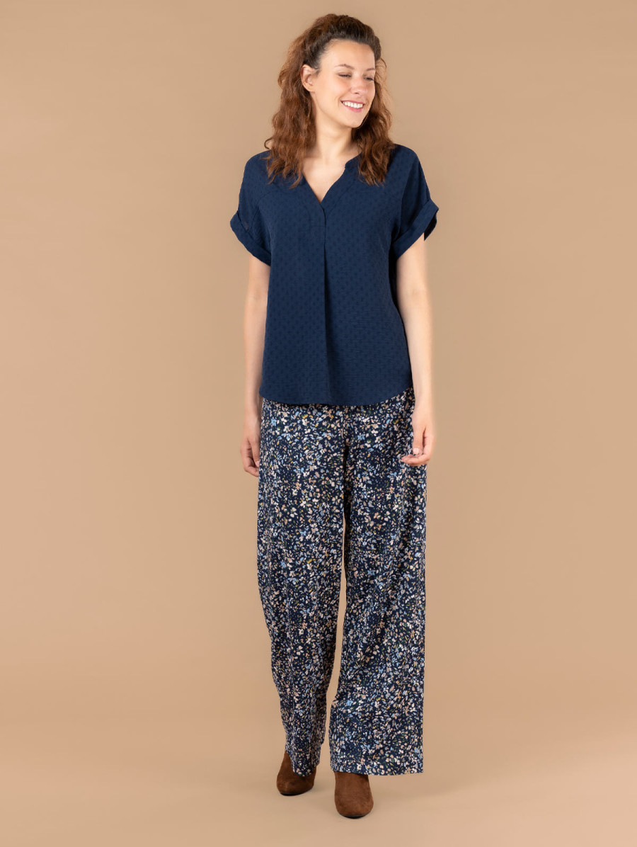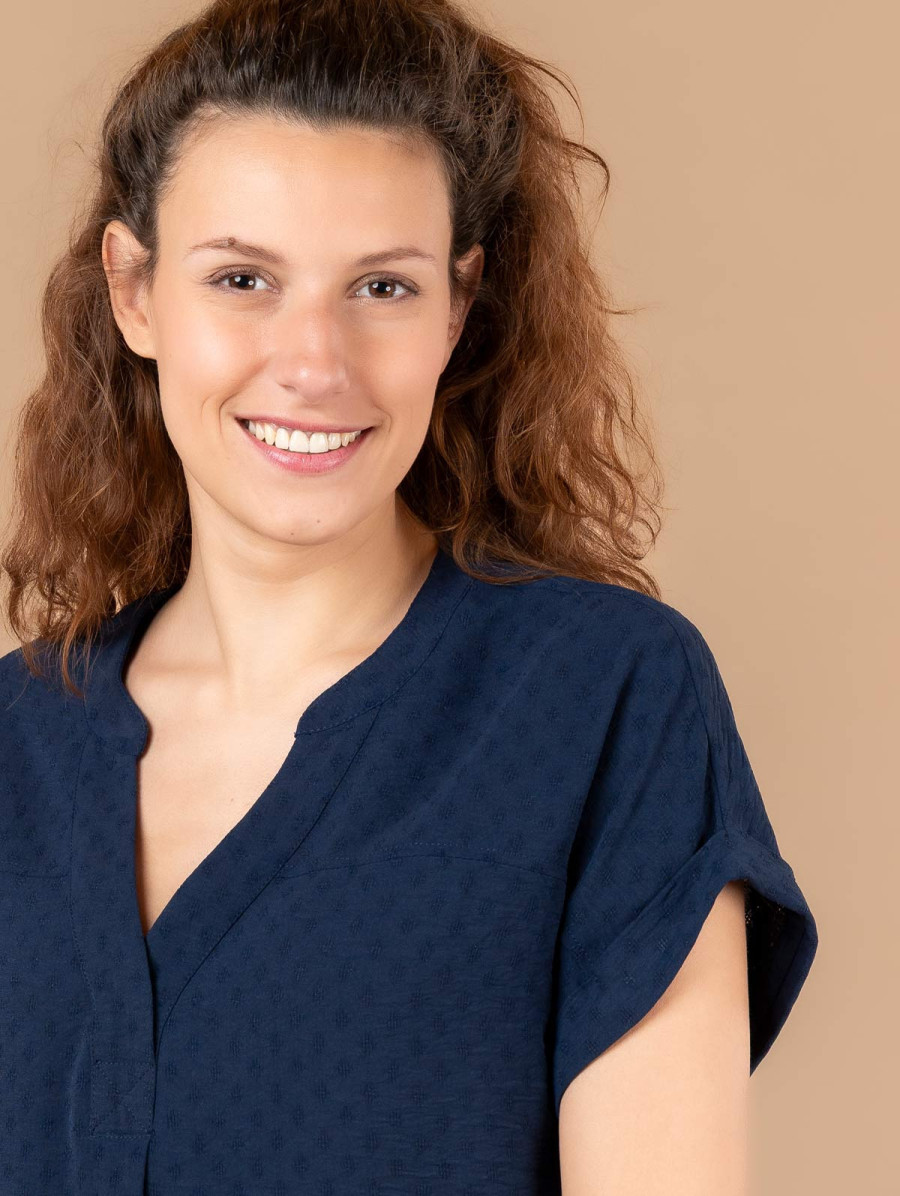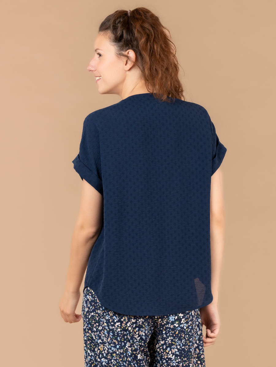 Ce top pour femme en tissu jacquard est une pièce élégante à la fantaisie subtile. Vous aimerez ses finitions revers aux manches ainsi que son joli col tunisien. Existe en burlat et lazulite. Longueur totale pour une taille 38 : 66 cm environ. Notre mannequin mesure 1,73m et porte une taille 38.