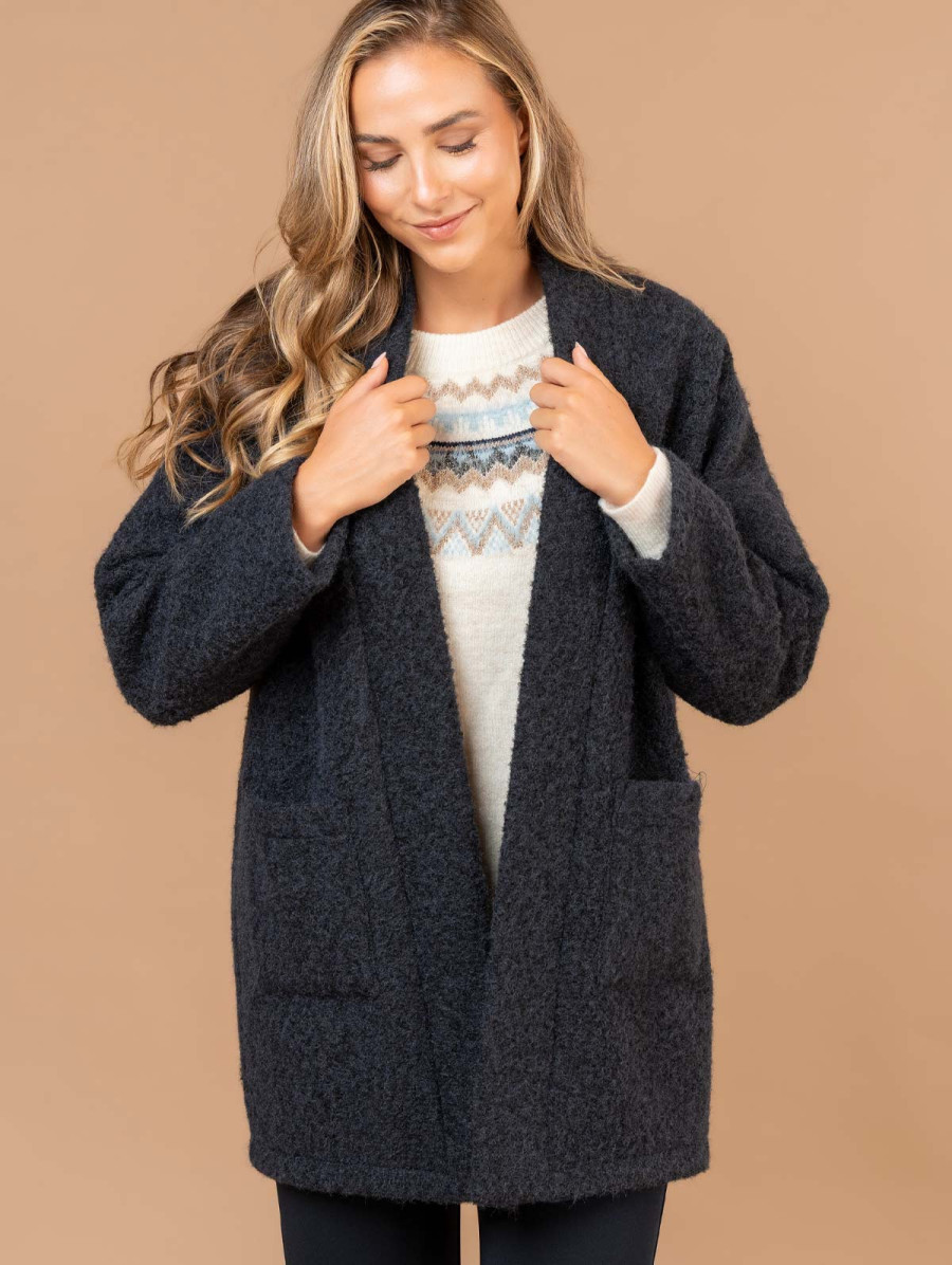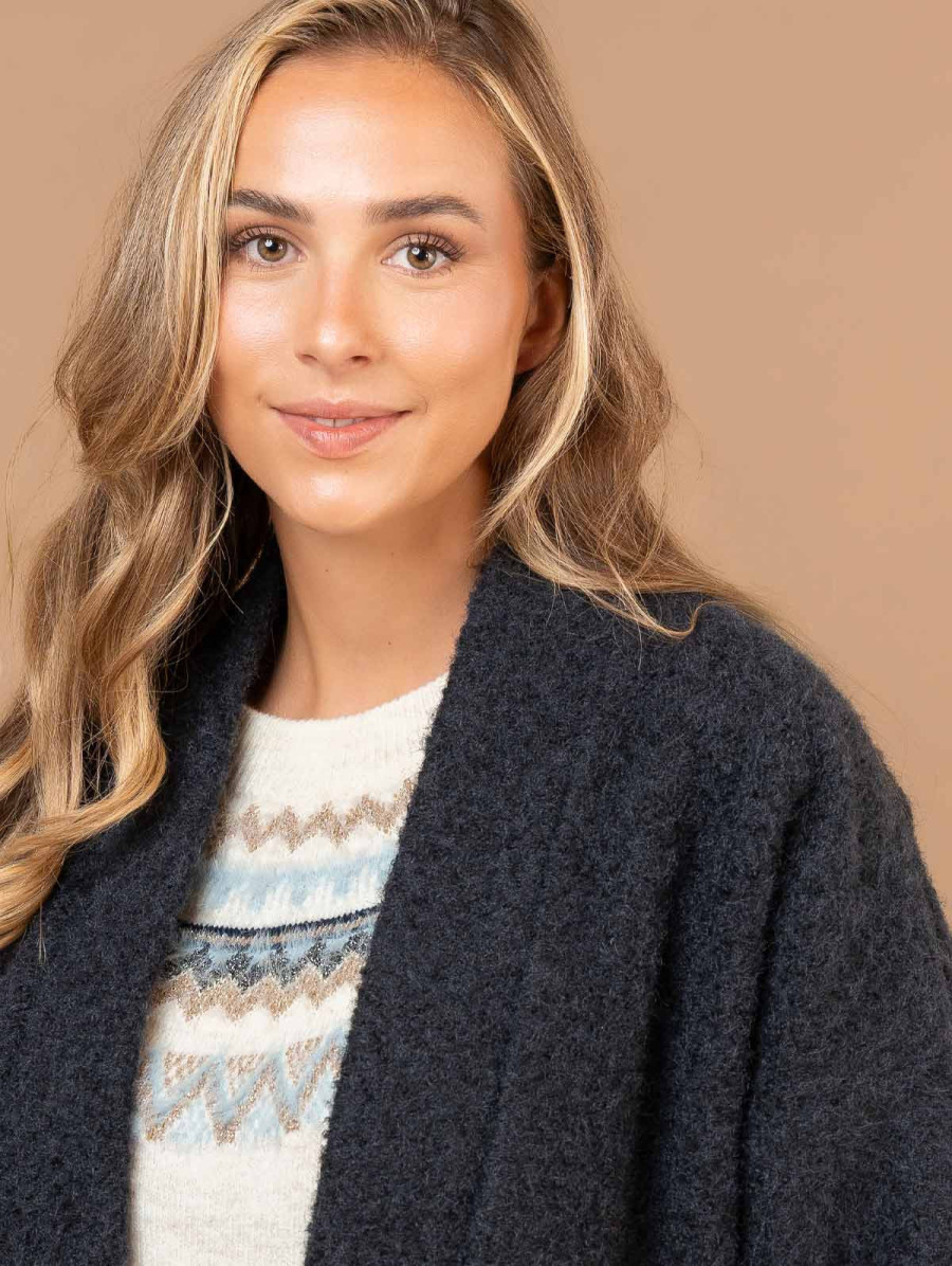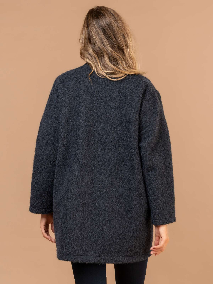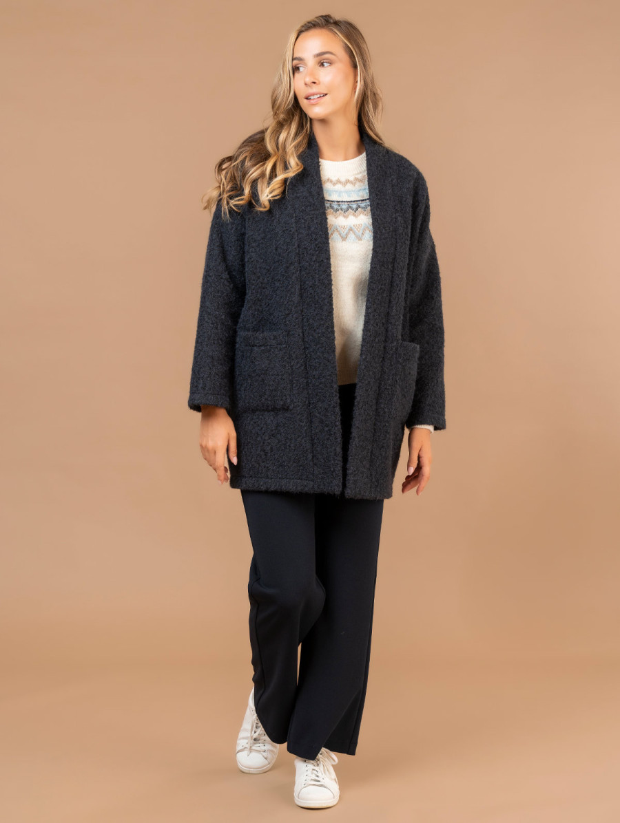 Apportez la touche finale à votre tenue avec ce manteau en maille pour femme. Doté de deux poches plaquées, son style sobre le rend facile à assortir avec un grand nombre de looks ! Existe en marine, marron et noir. Longueur totale pour une taille 38 : 83 cm environ. Notre mannequin mesure 1,73m et porte une taille 38.