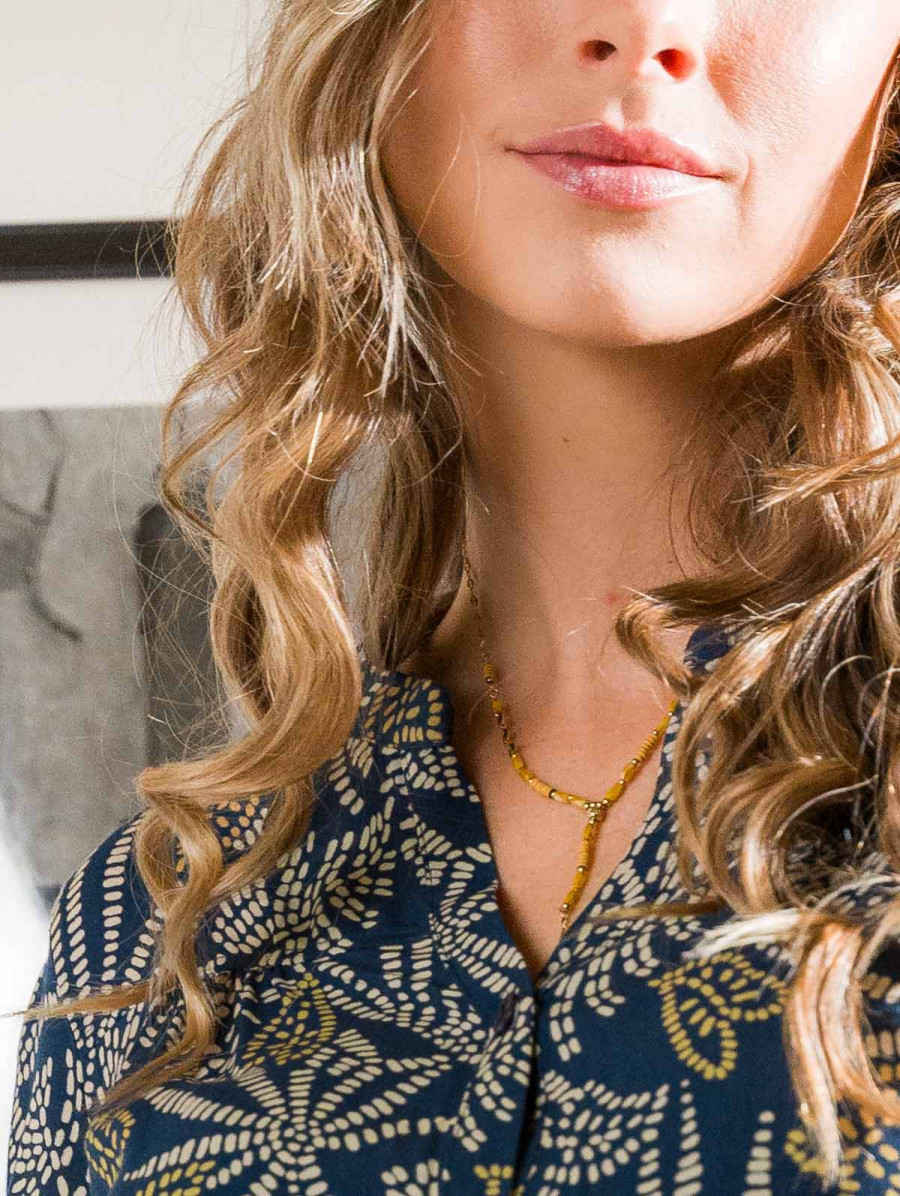 Cette blouse à l'imprimé feuilles fantaisie style pointillés est parfaite pour la saison ! On aime ses manches nouées 3/4, son col tunisien boutonné et son tissu fluide très agréable à porter. Existe en marine et noir. Longueur totale pour une taille 38 : 66 cm environ. Notre mannequin mesure 1,75m et porte une taille 38.
