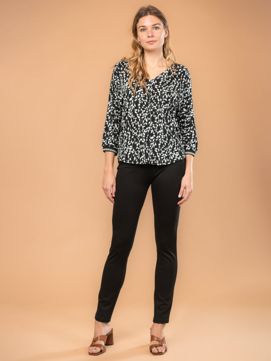 On aime l'élégance de cette blouse pour femme à l'imprimé feuillage, conçue dans un tissu fluide et dotée de manches 3/4. Le plus ? Sa surimpression gomme qui apporte un léger relief aux feuilles du motif ! Existe en marine et noir. Longueur totale pour une taille 1 : 62 cm environ. Notre mannequin mesure 1,75m et porte une taille 1.