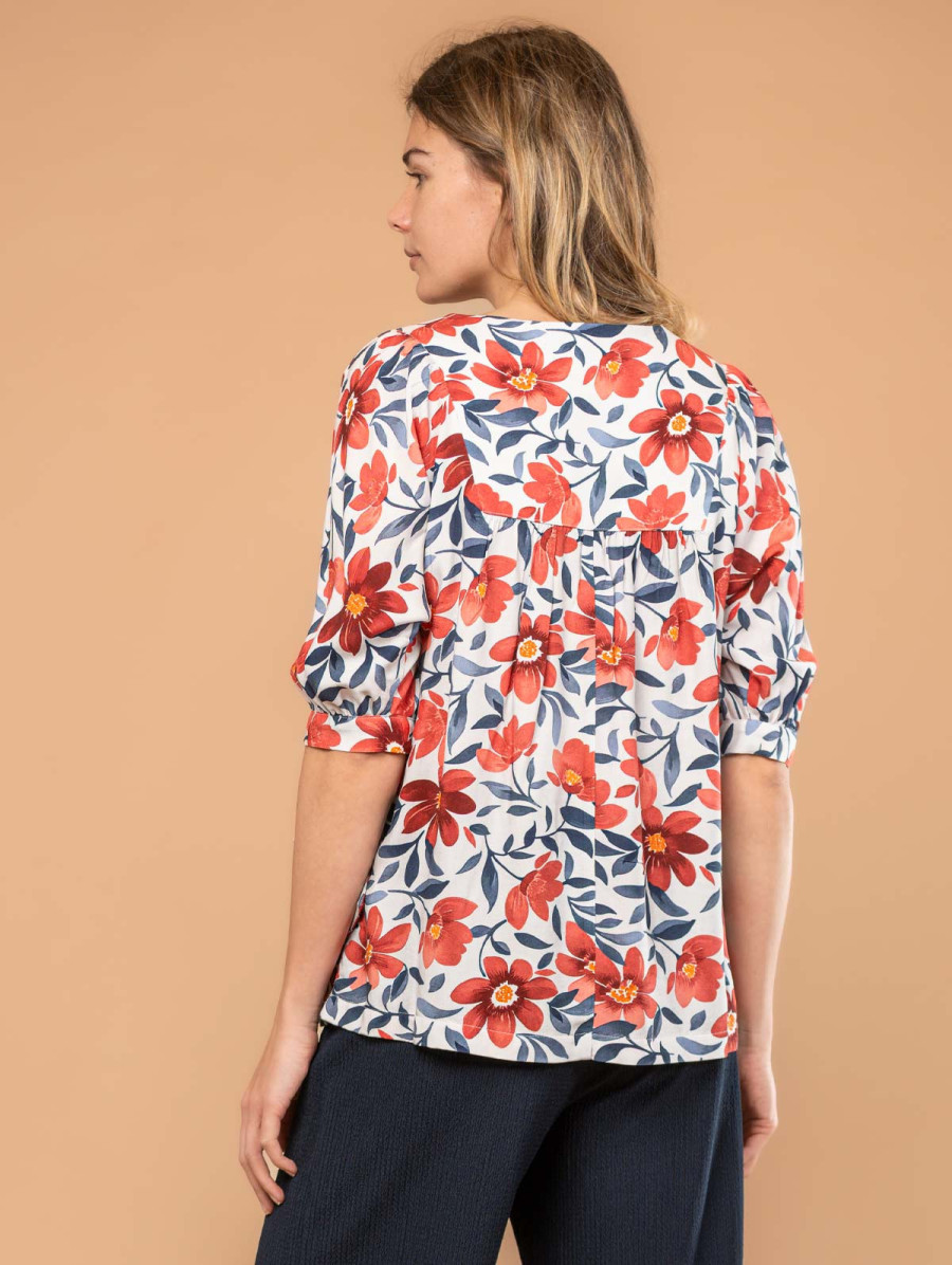 Fluide et agréable à porter, cette blouse à l'imprimé grandes fleurs et aux manches 3/4 nouées est parfaite pour agrémenter vos looks du quotidien ! Existe en noir et écru. Longueur totale pour une taille 38 : 64 cm environ. Notre mannequin mesure 1,75m et porte une taille 38.