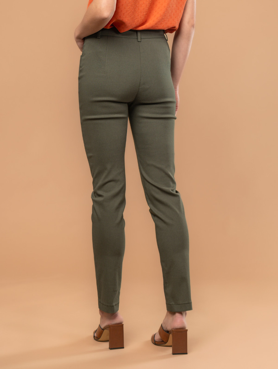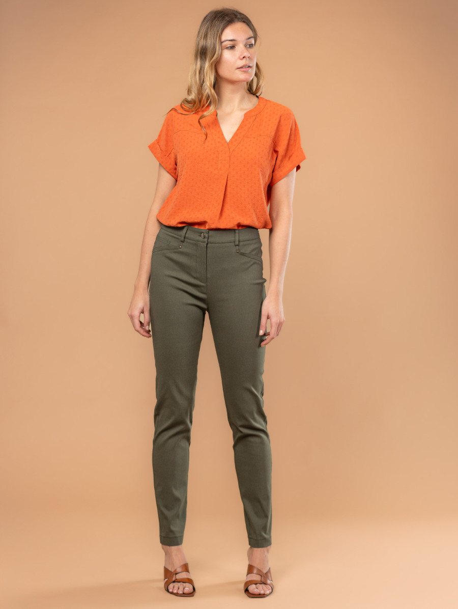 Très agréable à porter, ce pantalon uni pour femme en bengaline conjugue confort et élégance. Très facile à assortir, il se révèle être un précieux allié au quotidien. À la fois chic et décontracté, ce pantalon stretch et quasi-infroissable deviendra vite une pièce phare de votre dressing. Coupe droite, taille avec bouton et fermeture éclair, passants pour ceinture et deux fausses poches à l'avant avec clous fantaisie. Existe en dune et jungle. Longueur totale pour une taille 38 : 104 cm environ. Notre mannequin mesure 1,75m et porte une taille 38.