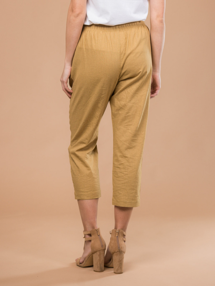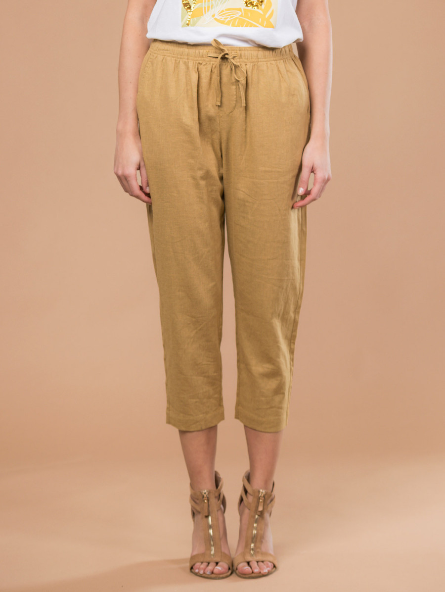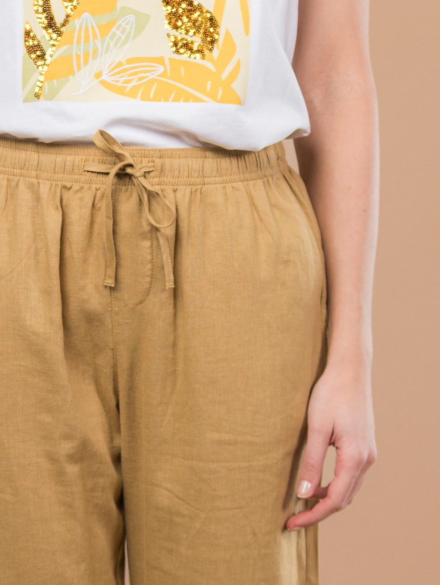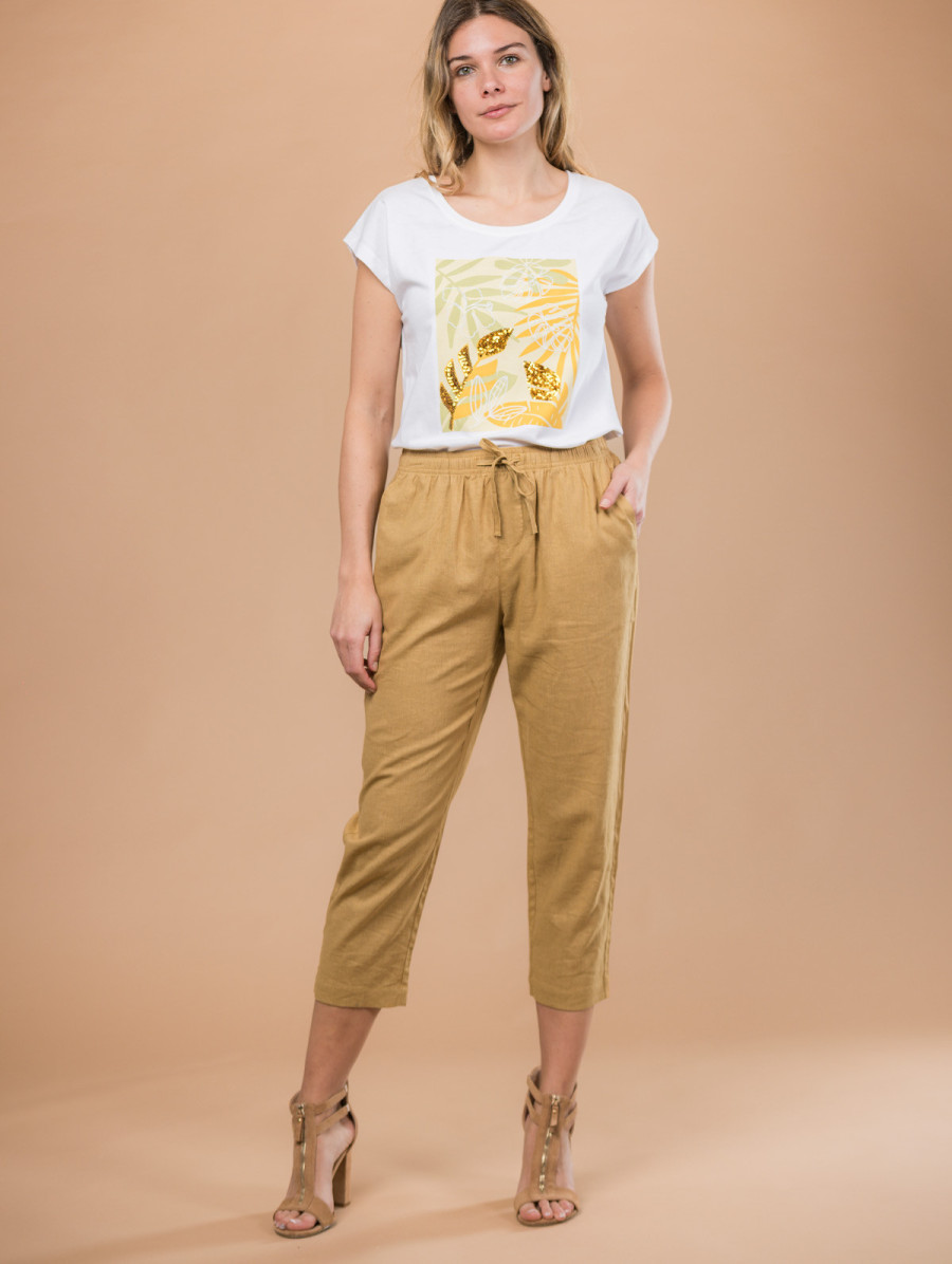 Craquez pour le confort de ce pantalon léger pour femme, très agréable à porter grâce à son mix de lin et de viscose. Taille élastiquée avec liens de serrage et deux vraies poches à l'avant. Existe en acacia et manioc. Longueur totale pour une taille 38 : 86 cm environ. Notre mannequin mesure 1,75m et porte une taille 38.