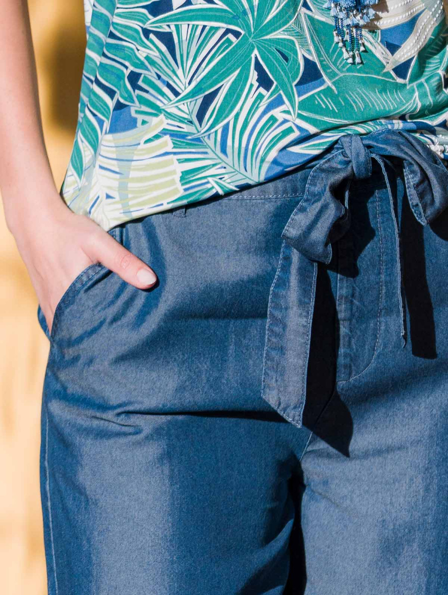 Très agréable à porter, ce pantalon large pour femme à l'effet denim et à la coupe 7/8 est notre coup de cœur. Confortable et pratique, il est muni d'une taille élastiquée au dos et de deux vraies poches à l'avant ainsi que d'une jolie ceinture à nouer ! Existe en bleach et light stone. Longueur totale pour une taille 38 : 92 cm environ. Notre mannequin mesure 1,75m et porte une taille 38.