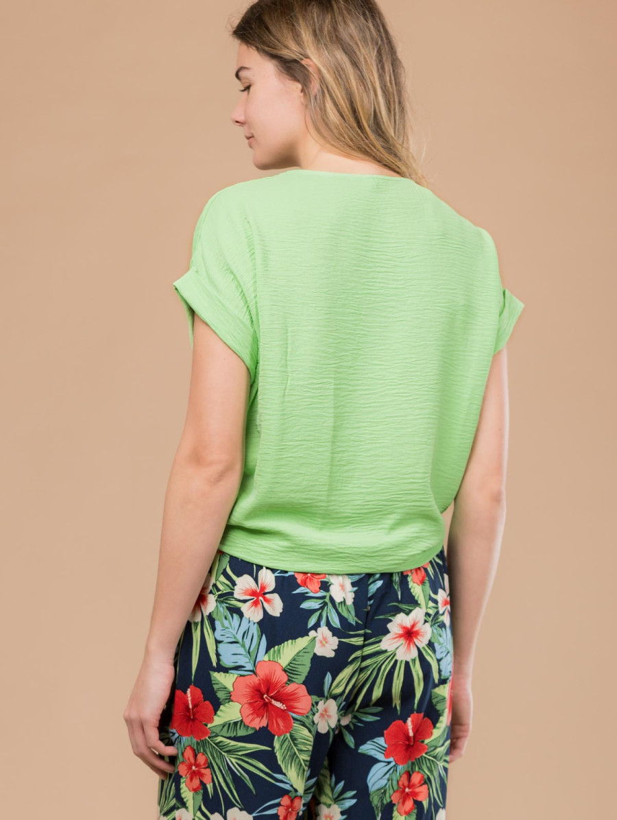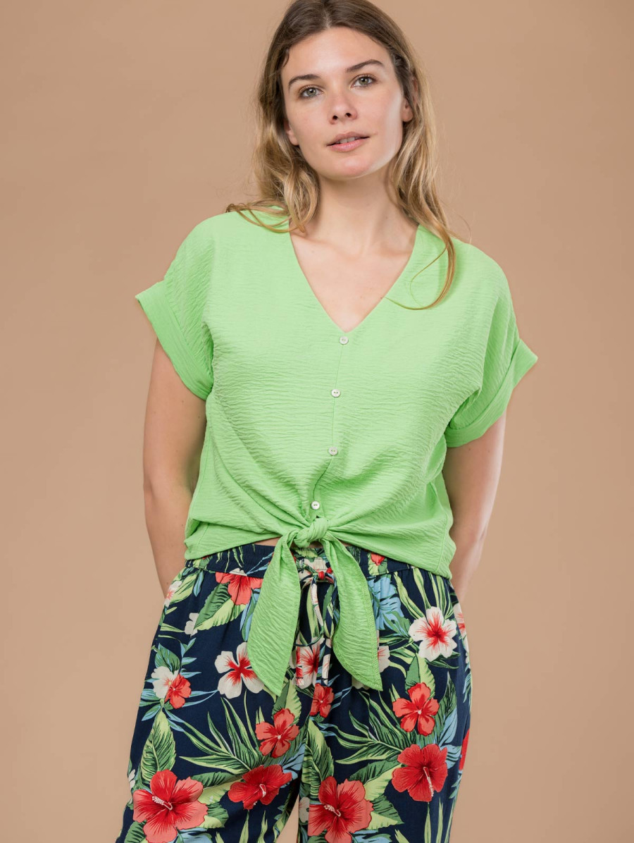 Très agréable à porter, cette chemise pour femme au tissu fluide et au bas noué est conçue dans un tissu texturé pour encore plus de fantaisie ! Existe en abricot et vert. Longueur totale pour une taille 38 : 63 cm environ. Notre mannequin mesure 1,75m et porte une taille 38.