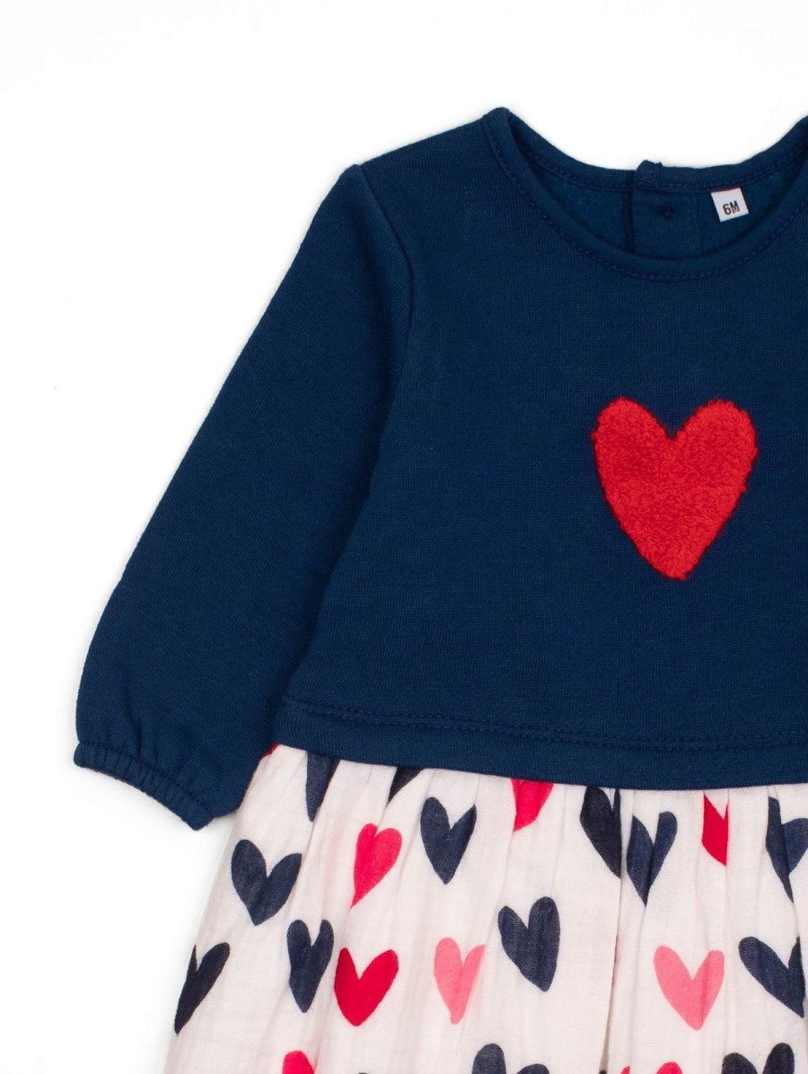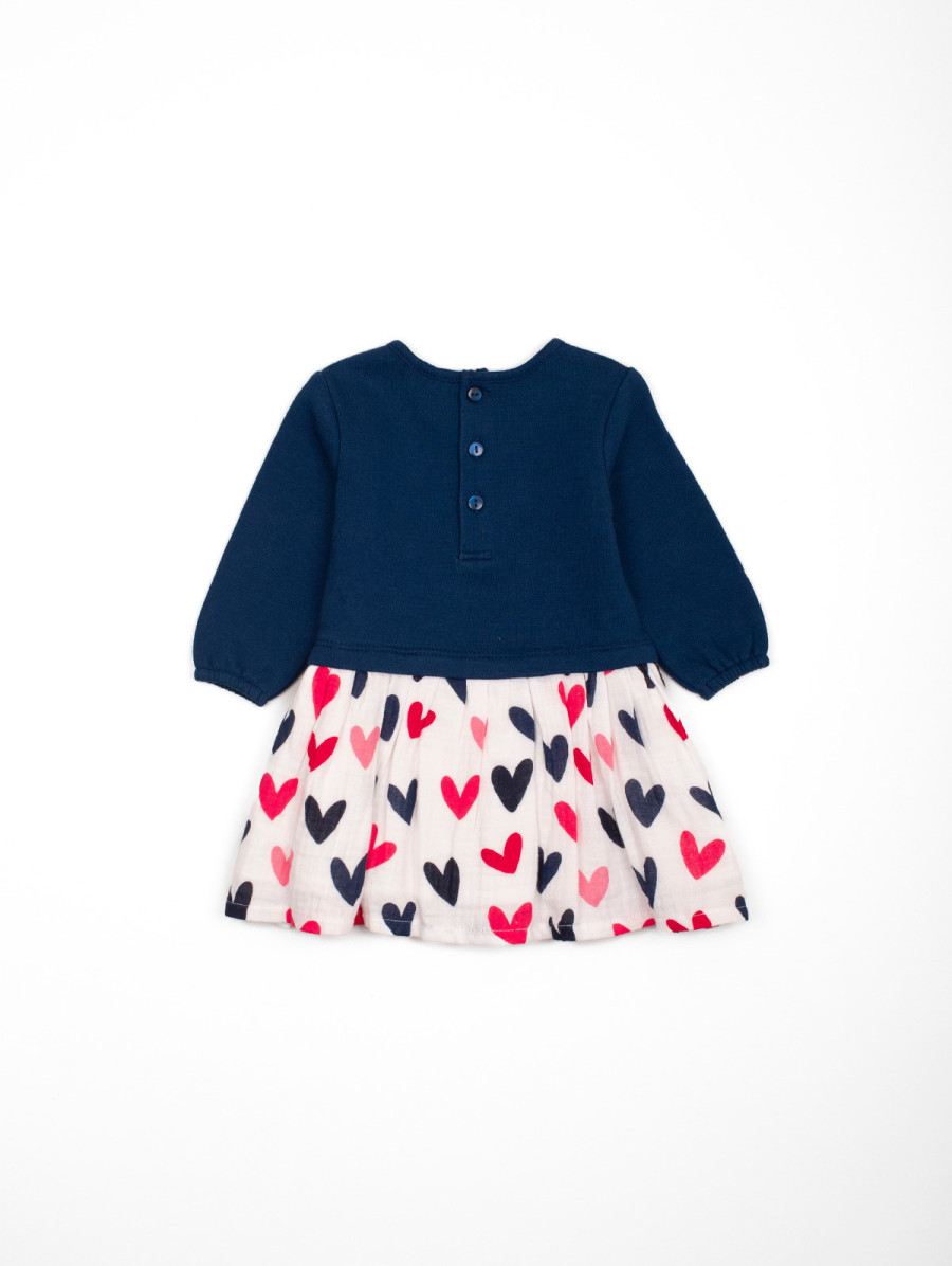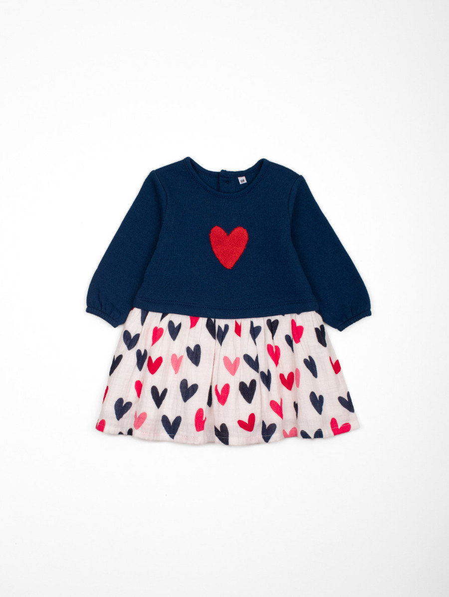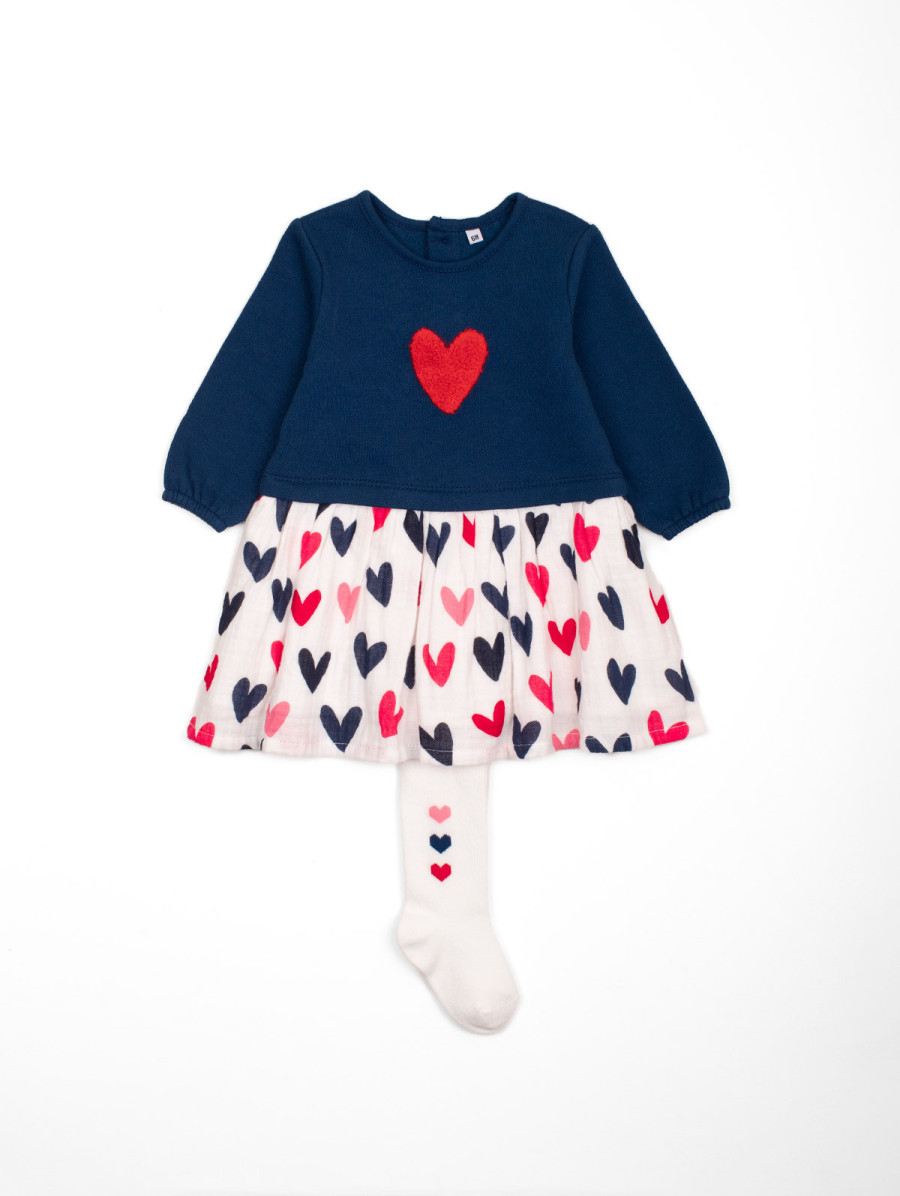 On adore cette robe 2-en-1 pour bébé-fille au thème cœurs : un haut façon sweat à manches élastiquées, fermé par de jolis boutons au dos et rehaussé d’un petit cœur en maille bouclette au milieu, associé à une jupe en maille fantaisie texturée, doublée de popeline de coton. Donnant l’illusion d’un ensemble coordonné, cette robe devient vite un essentiel du quotidien. Une paire de collants assortis vient parfaire cette tenue pleine de tendresse. Existe en amiral et coquelicot.