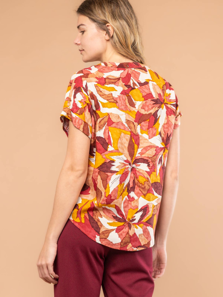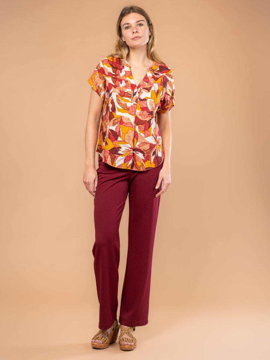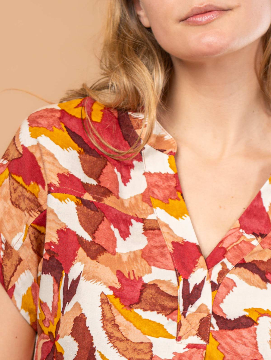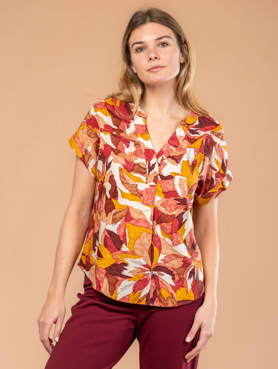 Cette blouse pour femme au col tunisien et à l'imprimé feuilles fantaisie fera des merveilles avec un pantalon uni ! Légère et agréable à porter, elle allie avec brio confort et élégance... Existe en rouille et vert. Longueur totale pour une taille 38 : 66 cm environ. Notre mannequin mesure 1,75m et porte une taille 38.