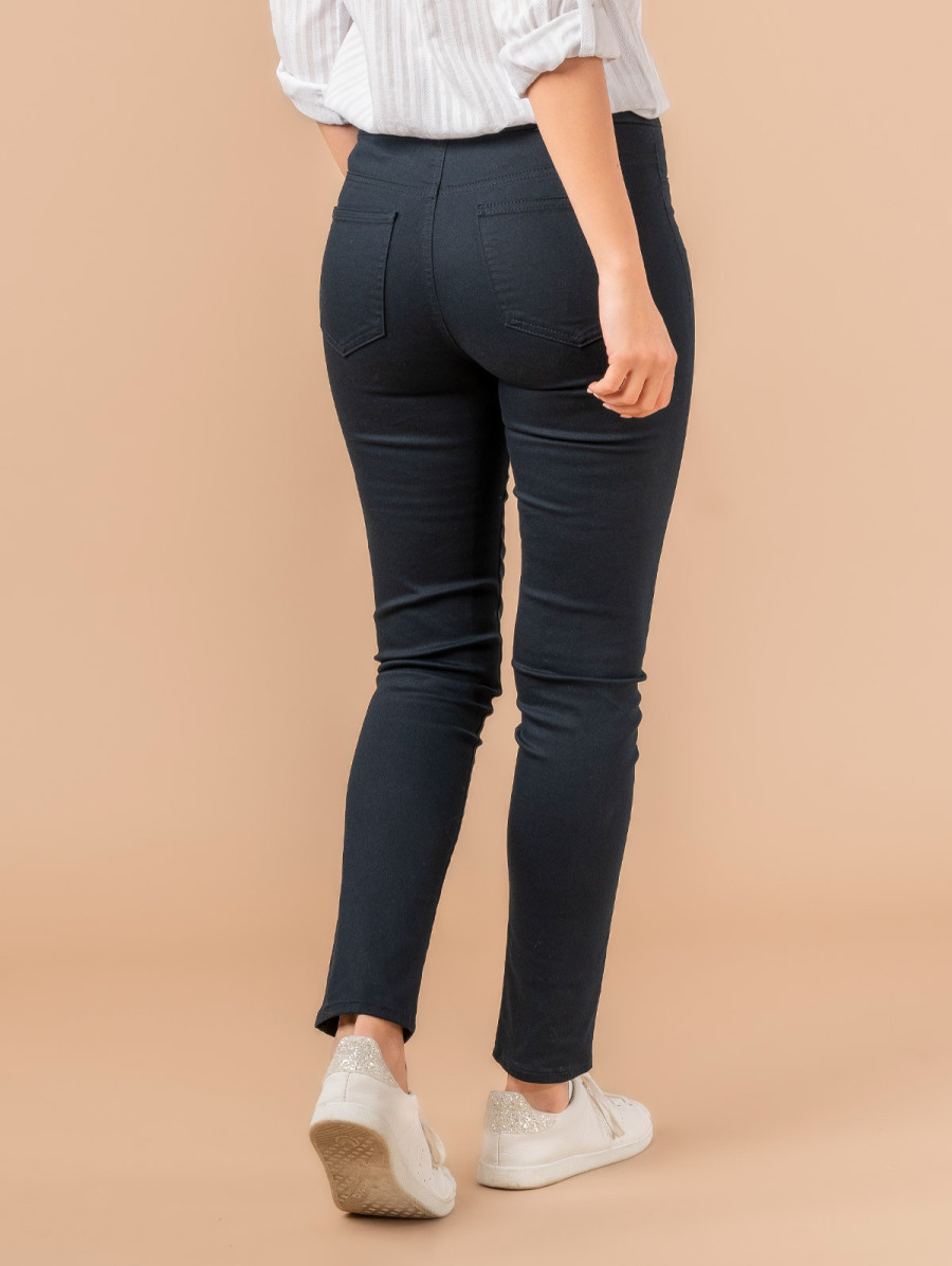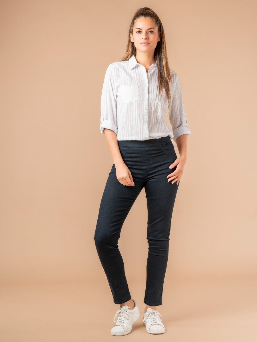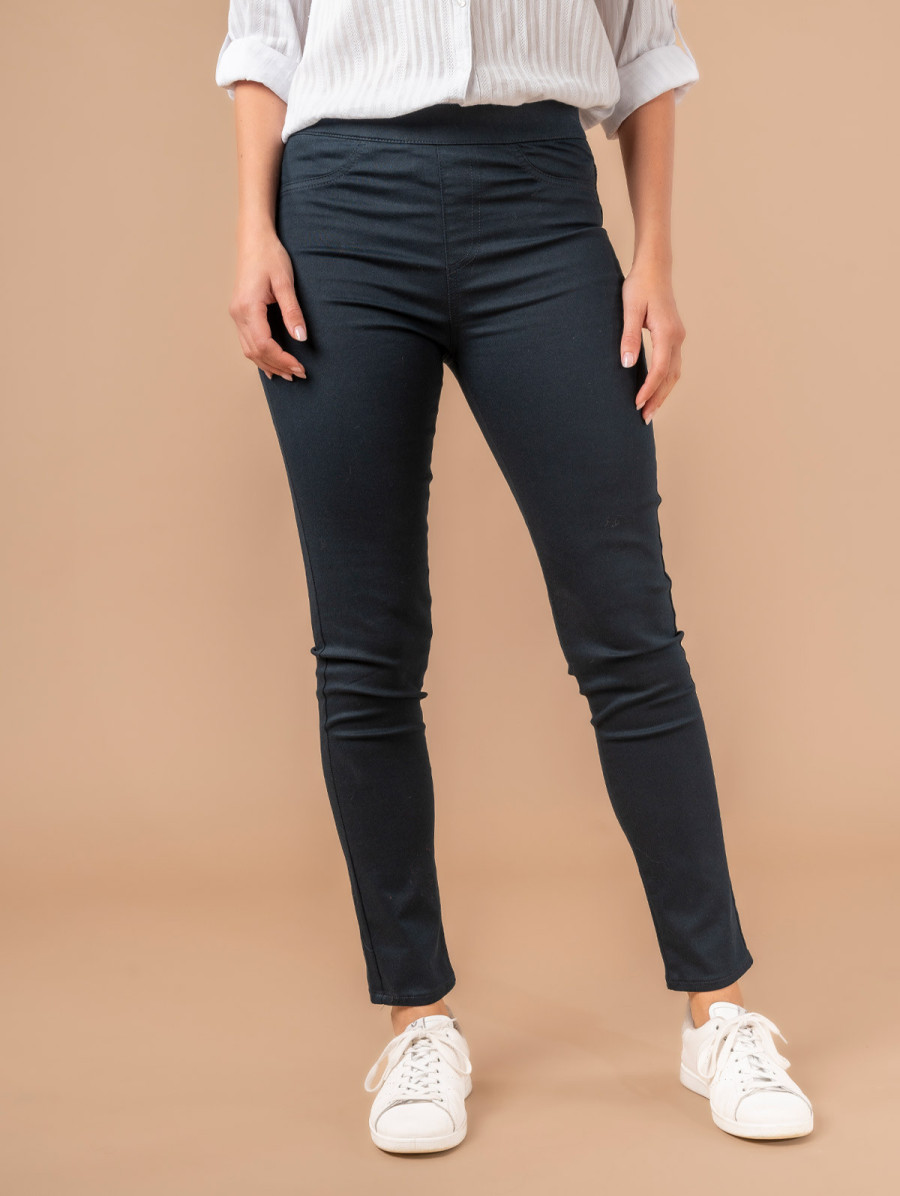 Alliez style et confort au quotidien avec ce jegging uni pour femme sobre et indémodable. Doté d'une ceinture élastiquée, de fausses poches fantaisie à l'avant avec surpiqûres et de deux vraies poches à l'arrière, cet essentiel vous garantit le confort d'un legging allié au look d'un vrai pantalon. Un intemporel facile à assortir dont vous ne pourrez bientôt plus vous passer... Existe en marine et noir. Longueur totale pour une taille 38 : 100 cm environ. Notre mannequin mesure 1,75m et porte une taille 38.