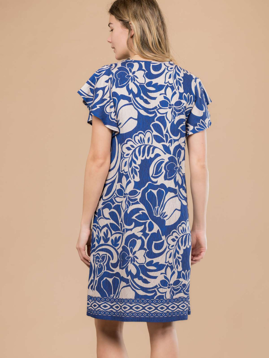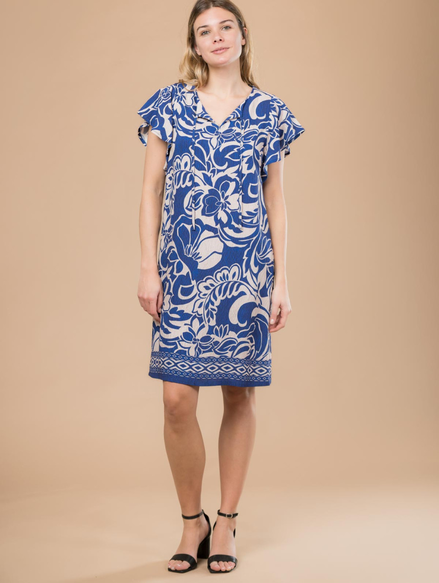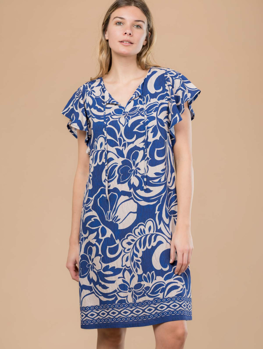 Très agréable à porter, cette robe imprimée aux fleurs bicolores accompagnera vos plus beaux moments cet été ! Existe en bleu et noir. Longueur totale pour une taille 38 : 99 cm environ. Notre mannequin mesure 1,75m et porte une taille 38.