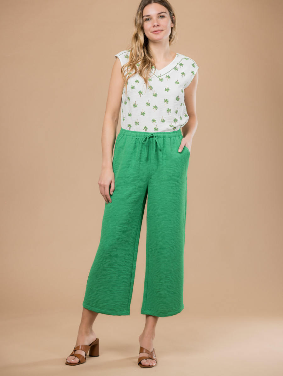 Doté d'une taille élastiquée et de deux vraies poches à l'avant, ce pantalon large au tissu fluide est idéal pour profiter des beaux jours en tout confort. Existe en absinthe et rouille. Longueur totale pour une taille 38 : 88 cm environ. Notre mannequin mesure 1,75m et porte une taille 38.