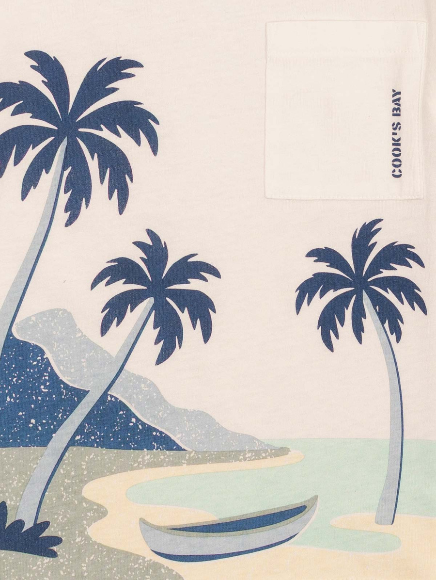 Évadez-vous un instant avec ce tee-shirt pour garçon à l'imprimé plage. Le plus : sa jolie poche plaquée à l'inscription "Cook's Bay" ! Existe en bleu de chine et salicorne.