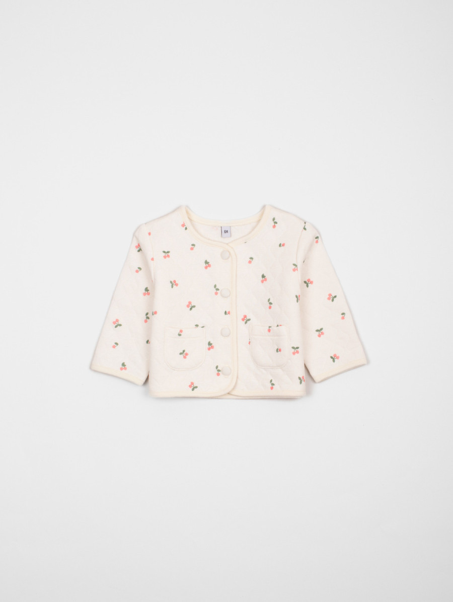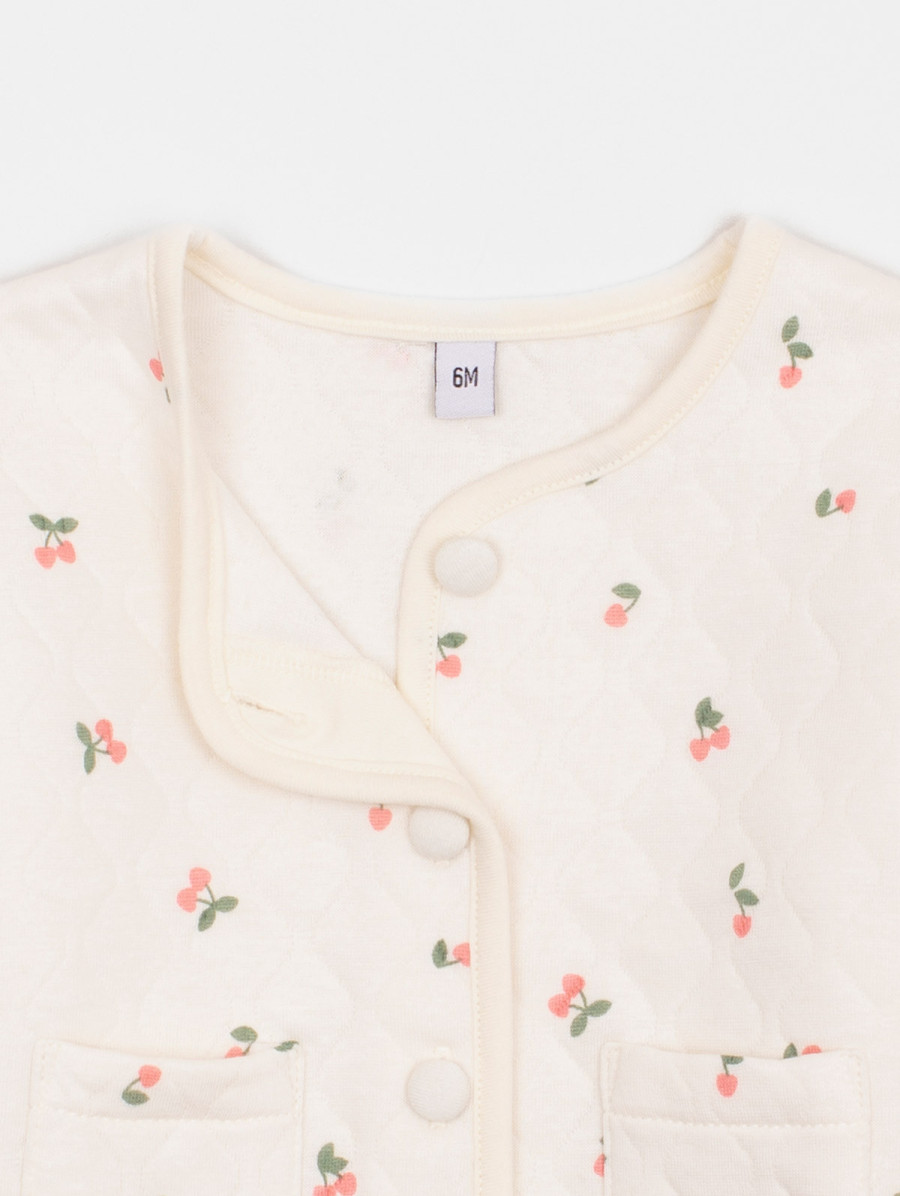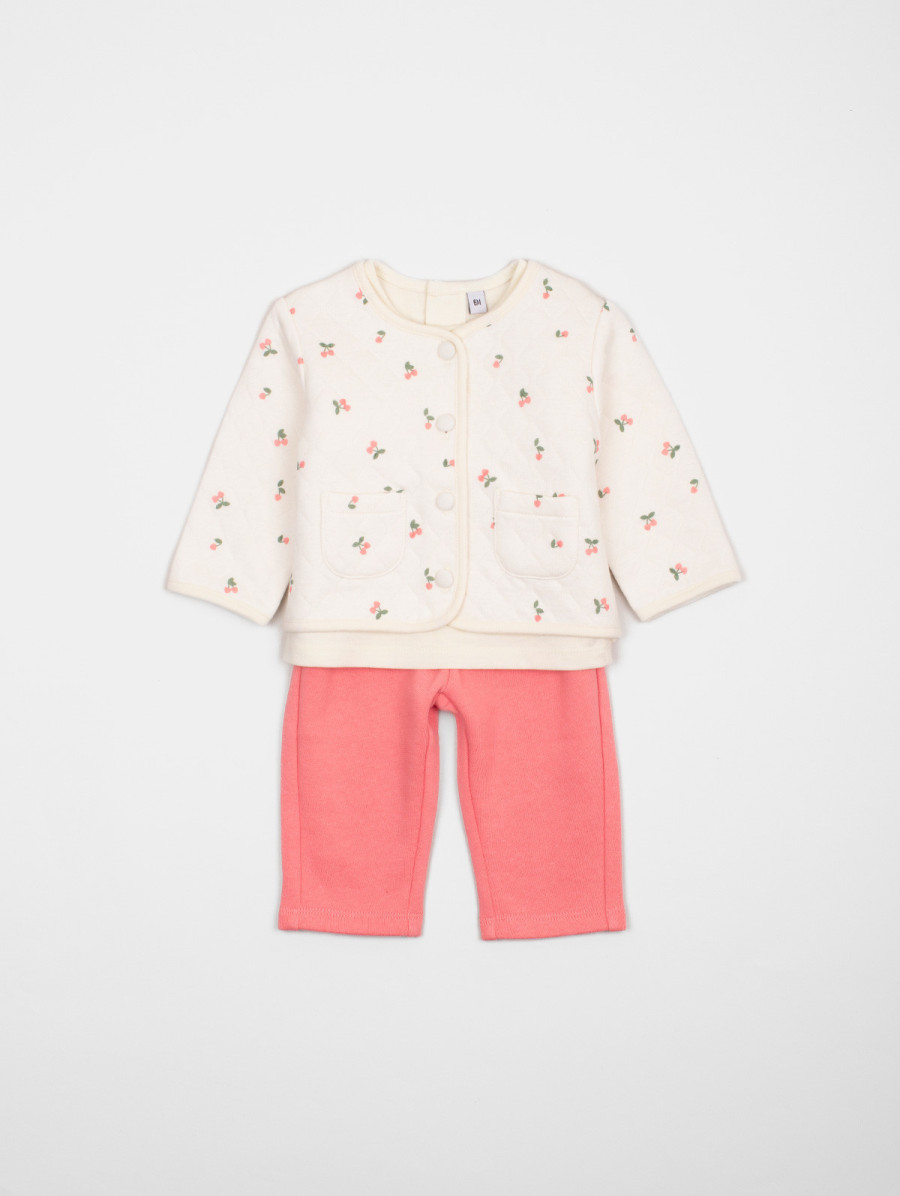 Cet ensemble 3 pièces pour bébé-fille est à croquer ! On aime son élégant cardigan au tissu matelassé à l'imprimé cerises, son tee-shirt uni au dos boutonné et son pantalon à la taille élastiquée. Existe en aubépine et coquelicot.