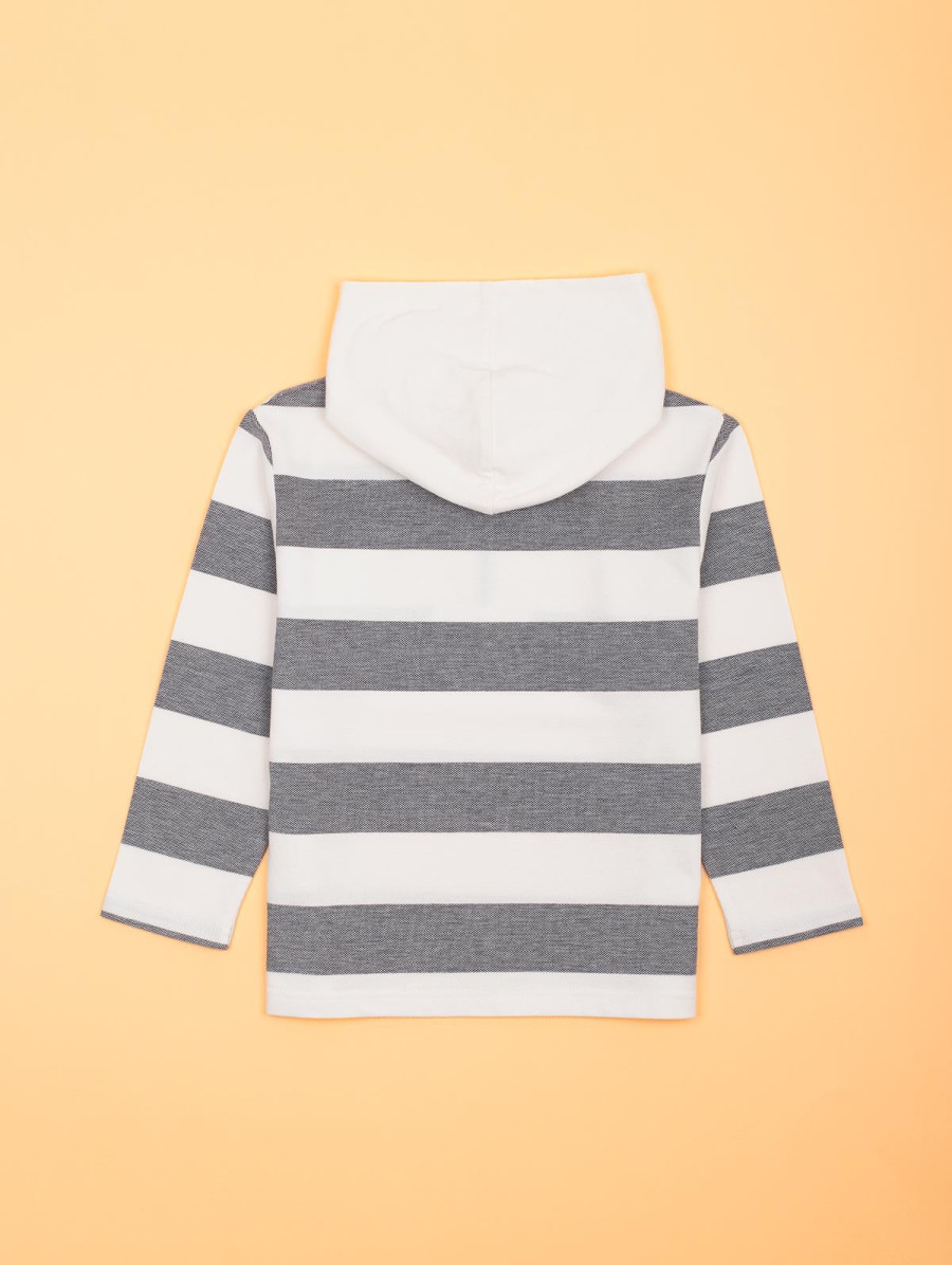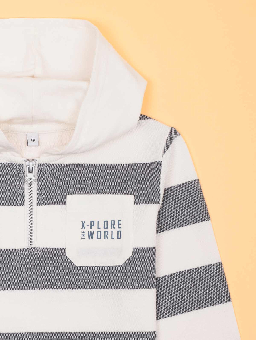 La marinière se revisite façon sportswear avec ce sweat rayé à capuche pour garçon. On aime son encolure zippée, sa capuche doublée jersey et sa jolie maille piquée. Une vraie poche plaquée au texte sérigraphié complète le look de cette pièce qui matchera parfaitement avec un jean ou un pantalon uni. Existe en amiral et origan.