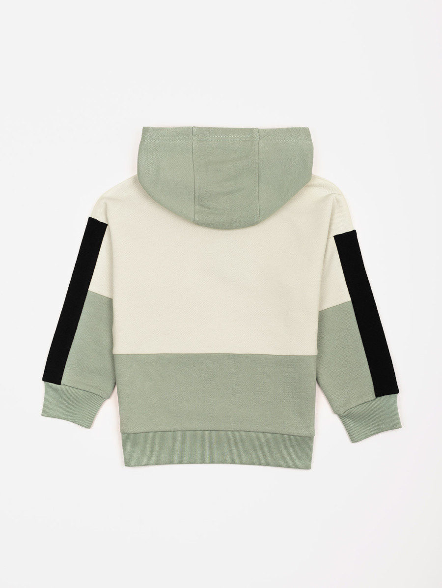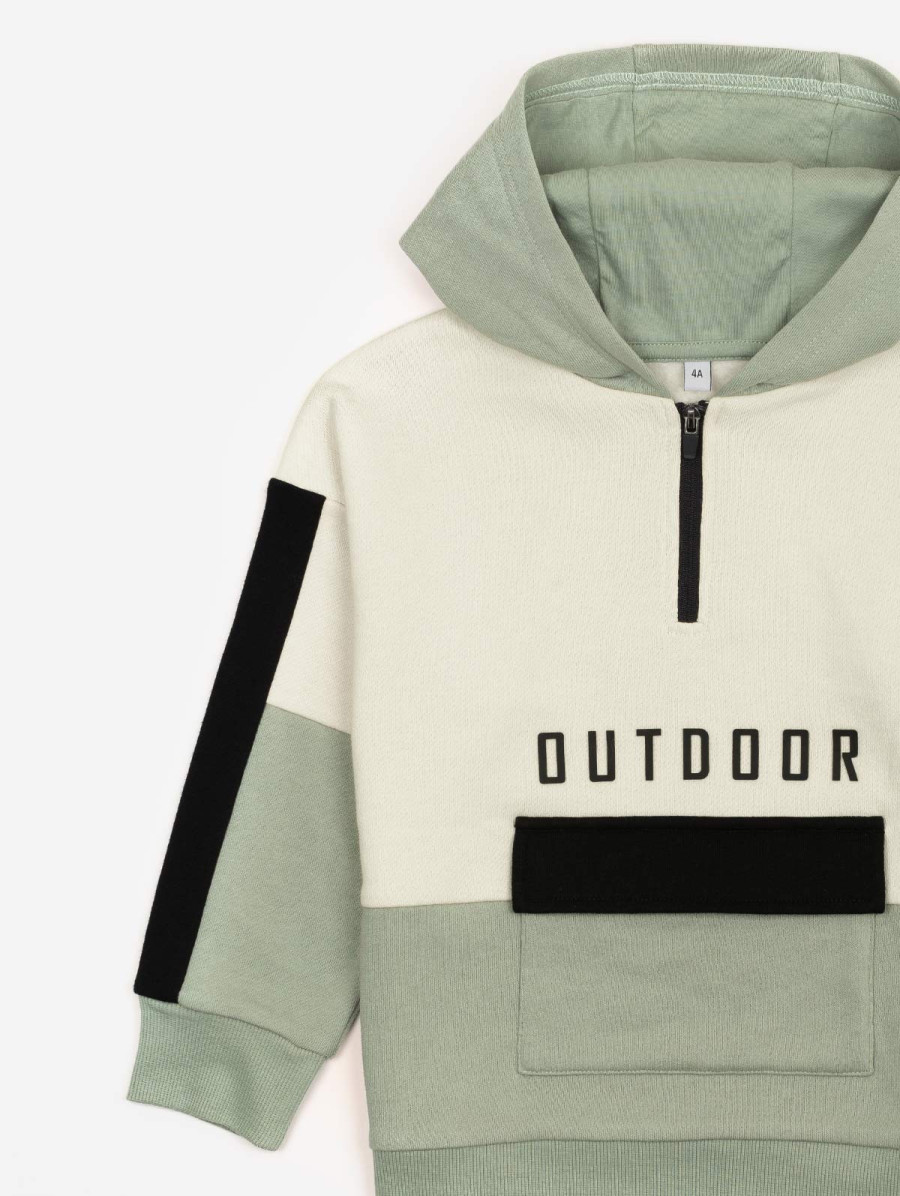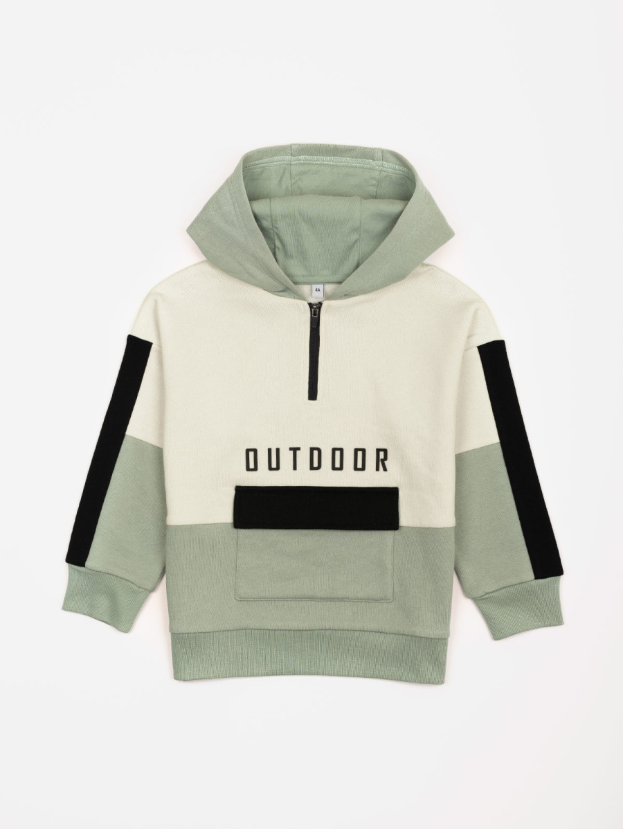 Véritable essentiel de la saison, ce sweat à capuche pour garçon avec col zip "Outdoor" a tout bon ! Très agréable à porter grâce à sa capuche doublée en jersey, on aime sa grande poche centrale, ses finitions en bord-côtes et son texte imprimé en relief. Des empiècements aux couleurs contrastées sur les manches complètent le look de cette pièce à l'esprit "sportswear". Existe en brume et estragon.