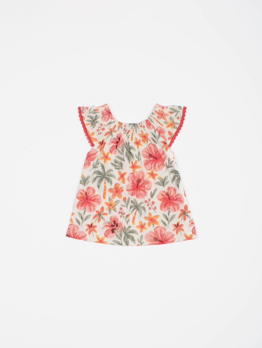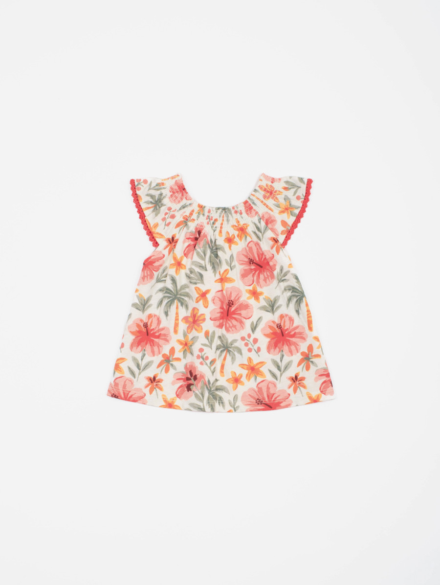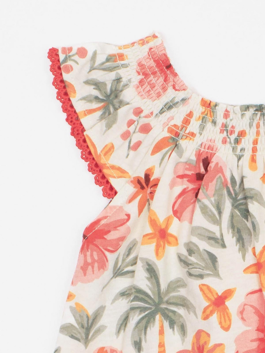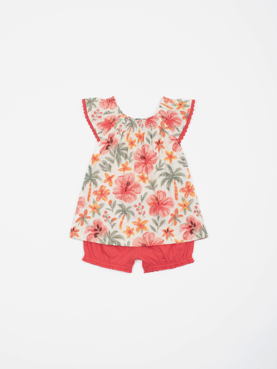 On adore cet ensemble pour bébé-fille composé d'une tunique à l'imprimé hibiscus et d'un short style bloomer ! Agrémentée d'une encolure smockée et de galons en macramé, sa tunique se marie parfaitement avec son short élastiqué 100% confort. Existe en impatience et pastèque.
