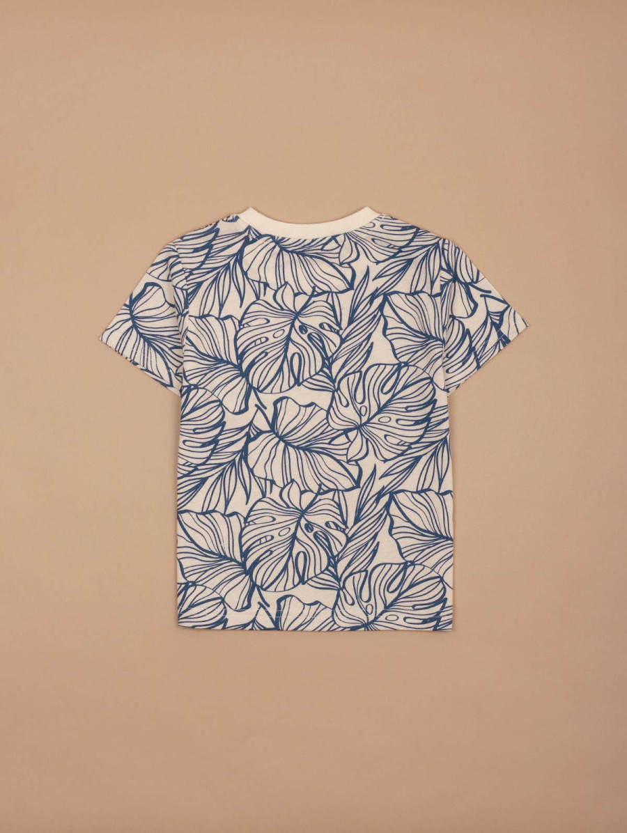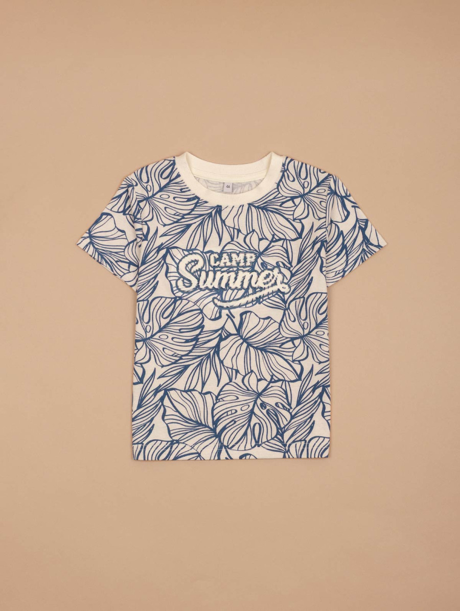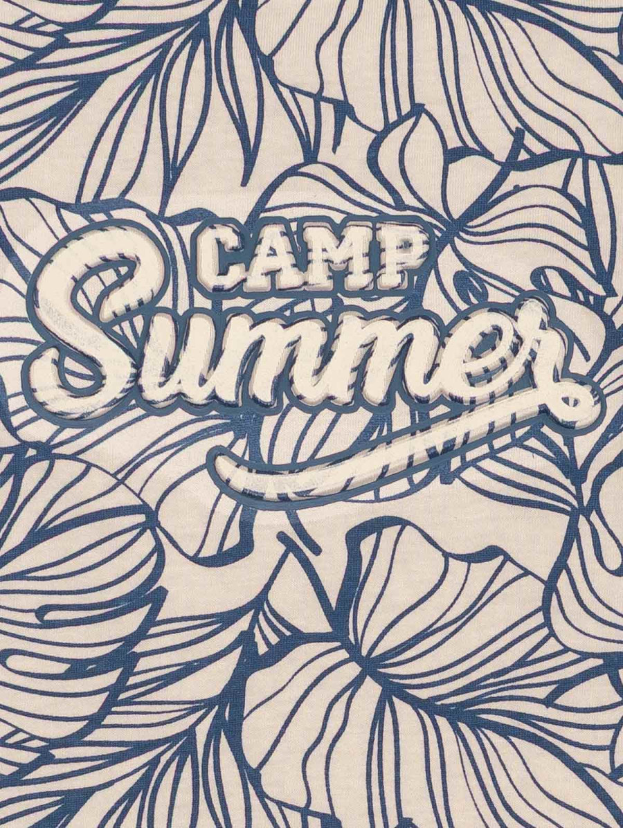 Ce tee-shirt pour garçon à l'imprimé tropical est parfait pour l'été ! Le plus : sa jolie inscription "Camp Summer" en relief pour encore plus de fun ! Existe en bleu de chine et salicorne.