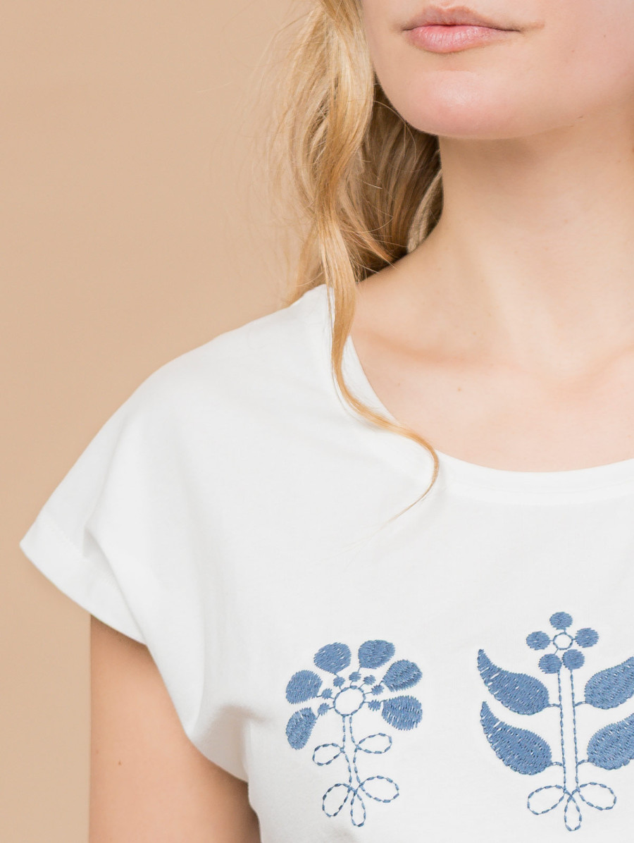 Ce tee-shirt pour femme, agrémenté de jolies fleurs brodées, est une pièce facile à porter qui ajoutera une petite touche d'originalité à vos looks du quotidien. Existe en écru et solitaire. Longueur totale pour une taille 1 : 63,5 cm environ. Notre mannequin mesure 1,75m et porte une taille 1.