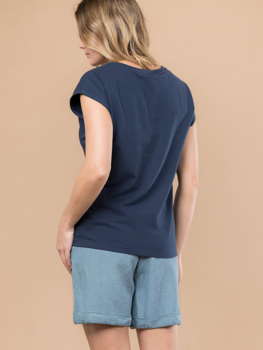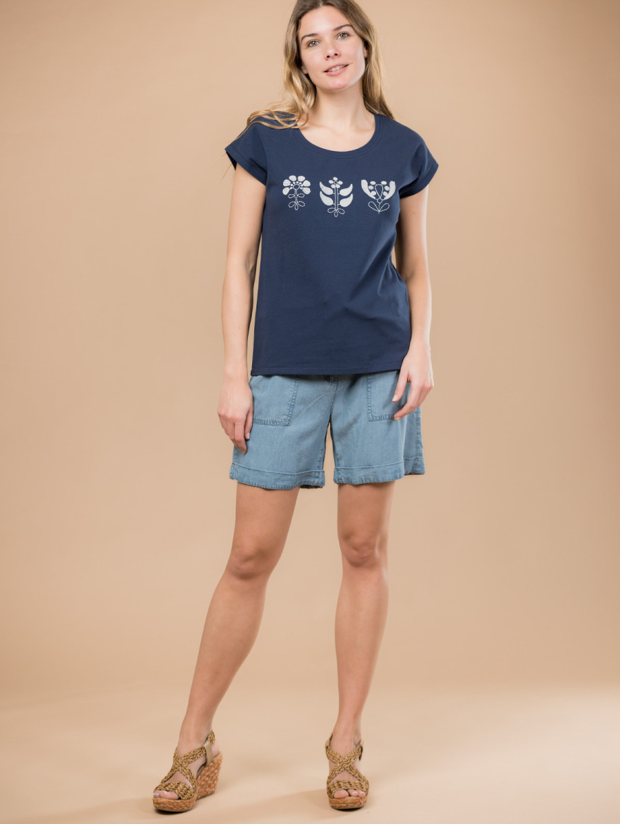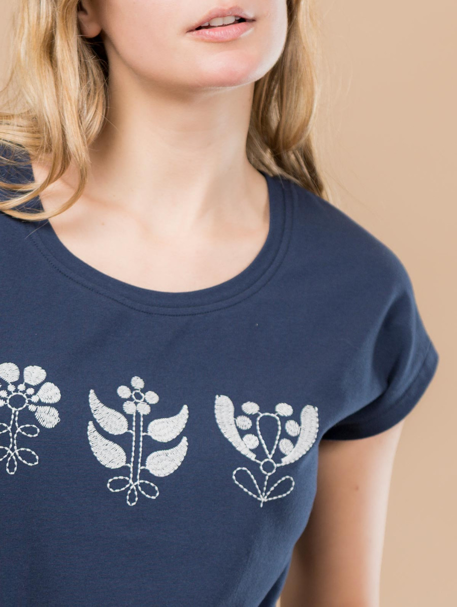 Ce tee-shirt pour femme, agrémenté de jolies fleurs brodées, est une pièce facile à porter qui ajoutera une petite touche d'originalité à vos looks du quotidien. Existe en écru et solitaire. Longueur totale pour une taille 1 : 63,5 cm environ. Notre mannequin mesure 1,75m et porte une taille 1.